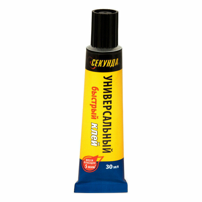 Универсальный быстрый клей "Секунда" состоит из полиуретана, ацетона, этилоксалата и других компонентов. Прозрачный. Применяется для соединения в различных сочетаниях дерева, металла, мягкого и жесткого ПВХ, полистирола, оргстекла, резины, войлока, кожи, фарфора, керамики, стекла. Удлиненный носик облегчает процесс нанесения клея. Водостойкость и высокие прочностные показатели позволяют использовать его для скрепления изделий, эксплуатирующихся под нагрузкой и в условиях высокой влажности. Склеивает пористые материалы. Тюбик содержит 30 мл универсального клея.