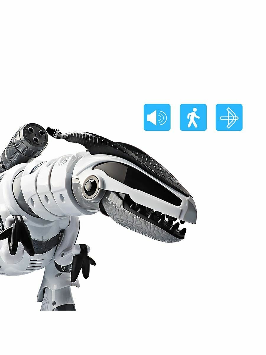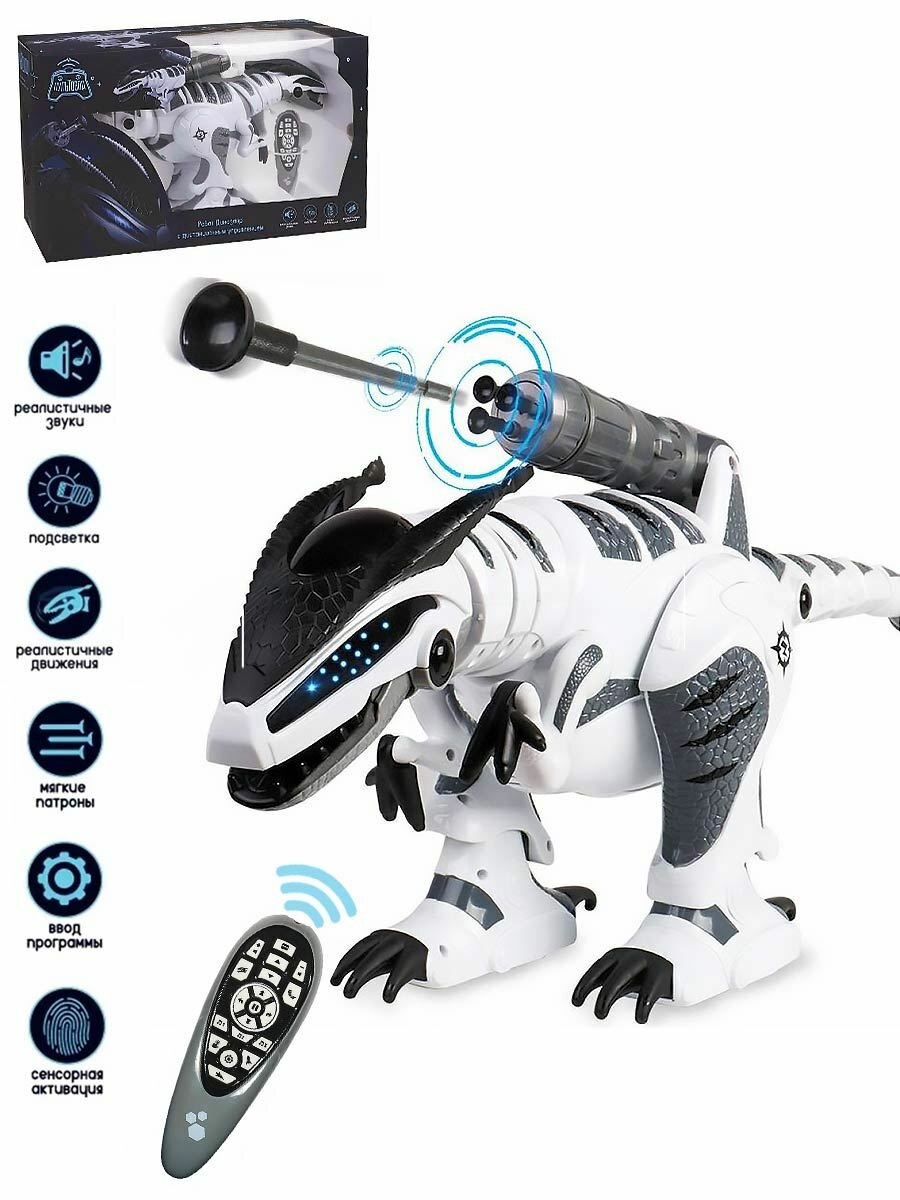 Игрушка на радиоуправлении: Динозавр из серии Пультовод. Игрушка стреляет мягкими пулями (6 шт.). Со звуковыми и световыми эффектами. USB-кабель входит в комплект. Электромеханический. С питанием от аккумулятора 3.7V (входит в комплект). Пульт р/у с питанием от батареек. Батарейки: 2*ААА (не входят в комплект). Основной конструкционный материал: пластмасса. Предназначено для детей от 3-х лет.
