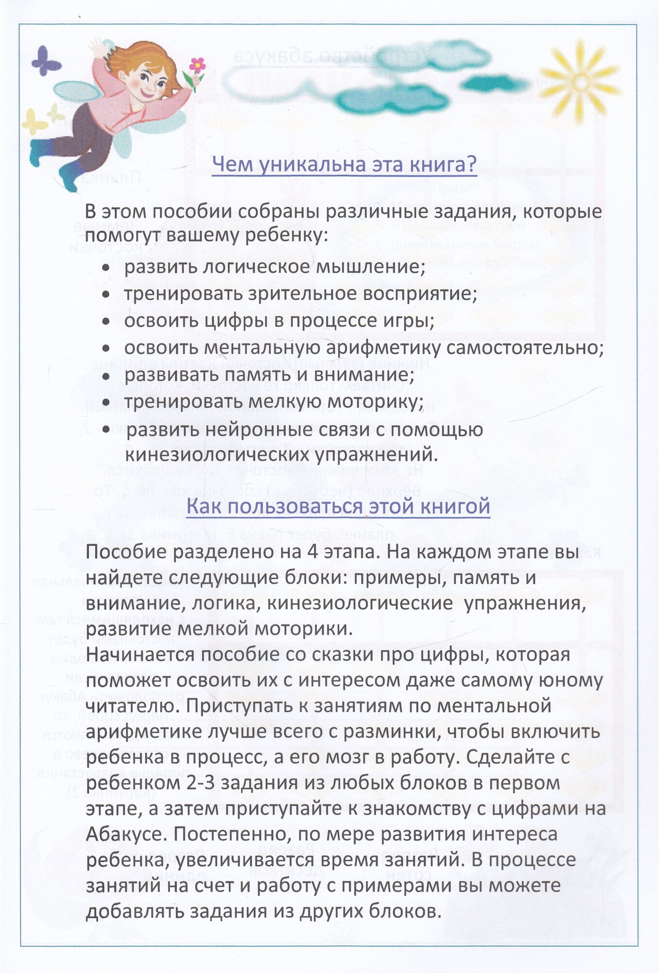 Главное достоинство данного пособия - интерес к математике, который возникает при знакомстве с этой книгой. А упражнения на память, внимание и логику позволяют сделать процесс изучения увлекательным и легким. Таким образом, данная книга поможет не только научить считать, но и комплексно развить математический склад ума, то есть улучшить логическое, критическое и аналитическое мышление ребенка.