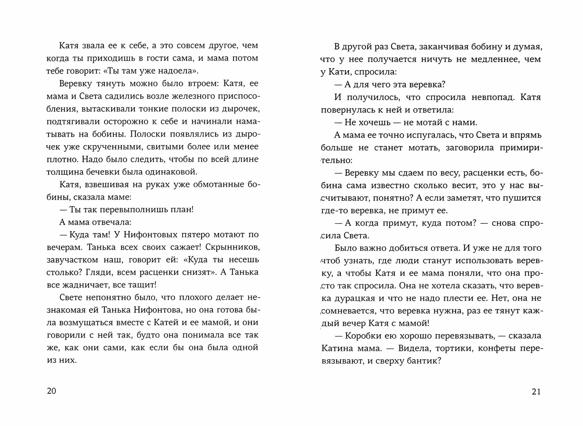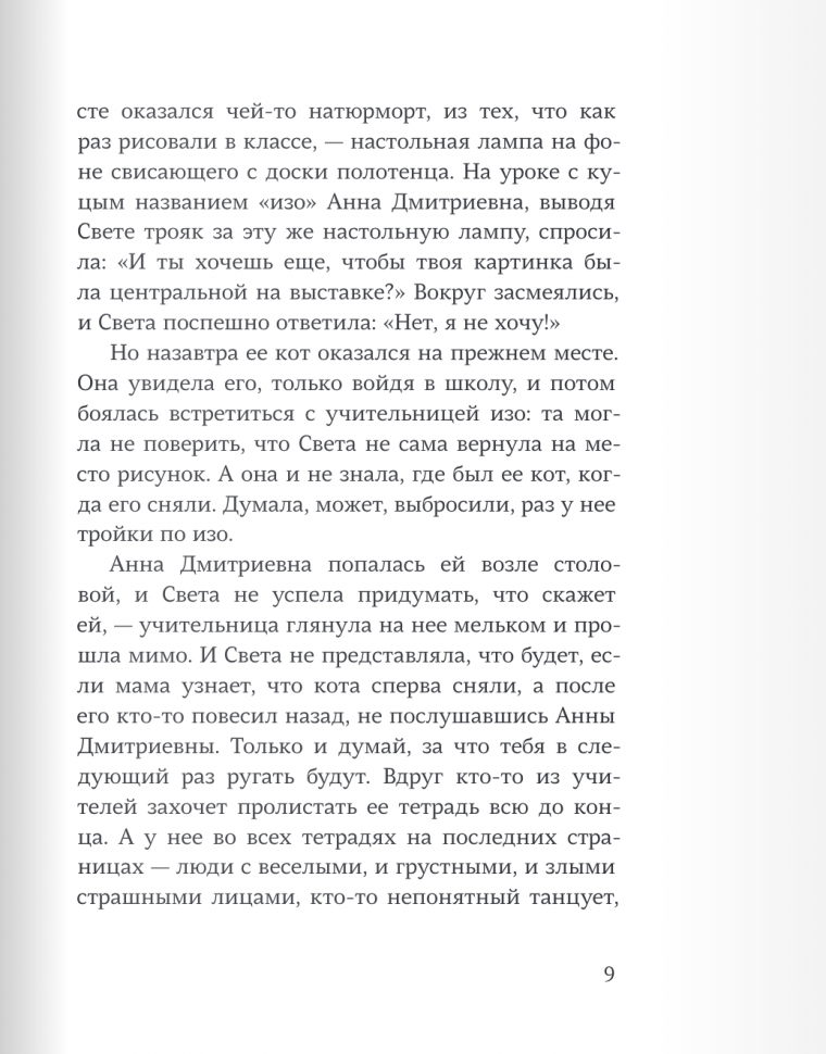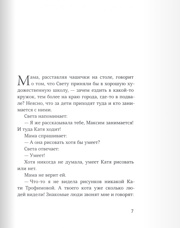 Света рисовала людей с миндалевидными ничего не выражающими глазами, и мама, если ей удавалось заглянуть к ней в тетрадь, говорила: "Никакого смысла, я никакого смысла не вижу! Раньше в твоих портретах хоть настроение передавалось!" И Света думала: "Значит, у меня получается рисовать Катю!"