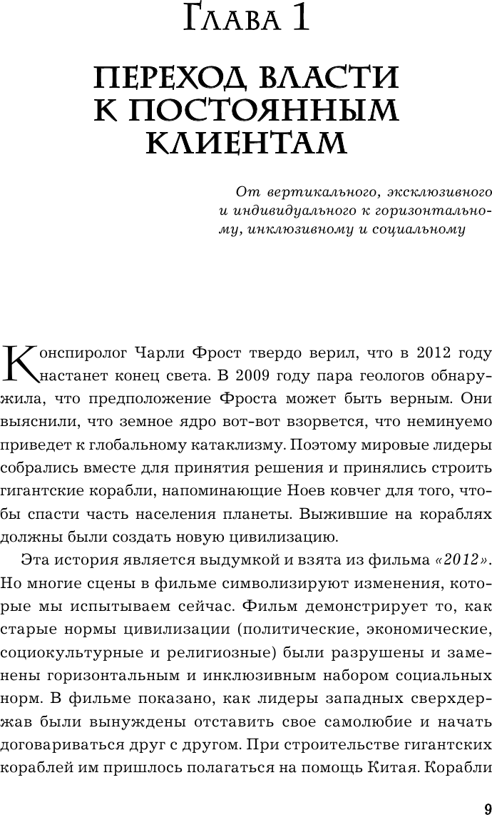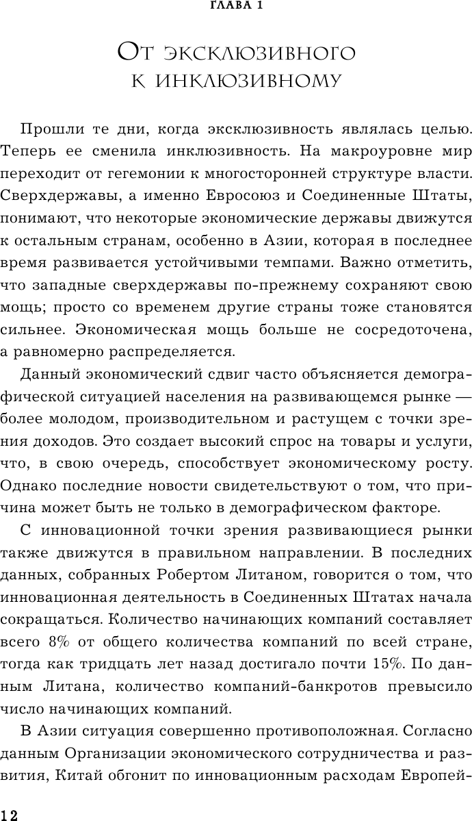 Поэтому нужно читать и изучать новые взгляды, теории и пробовать их жизнеспособность на практике.Нужно обращать внимание на взгляд со стороны и быть готовым меняться заранее, так как тот кто первый понимает суть вещей – приходит победителем и собирает максимальную прибыль. Вы можете не соглашаться с идеями, которые озвучены в книге или спорить с ними. В любом случае, стоит просто прочитать и попробовать.