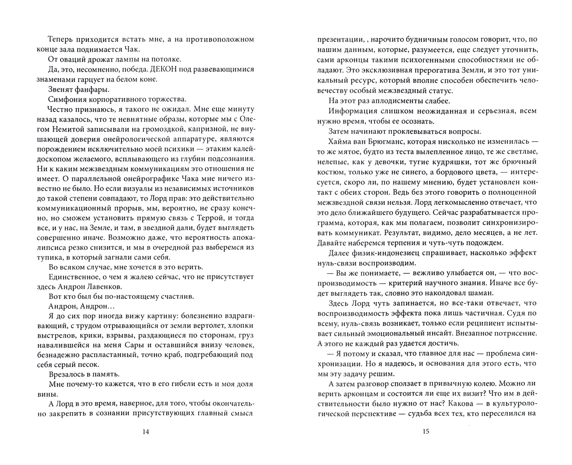 Второе, что выделяет книгу на общем фоне (кроме весьма приличного языка, что сейчас уже редкость) это русский взгляд на Контакт, несущий в себе огромное влияние АБС (и пожалуй Л. Толстого), но имеющий и свою собственную изюминку (и не одну). Самое главное в таком взгляде это высо-чайший и безжалостный подход автора к читателю, который считается ему равным и достойным прямого и честного разговора о главном - о смысле жизни, о сути и смысле Хомо - на основе принципиально материалистиче-ской платформы.