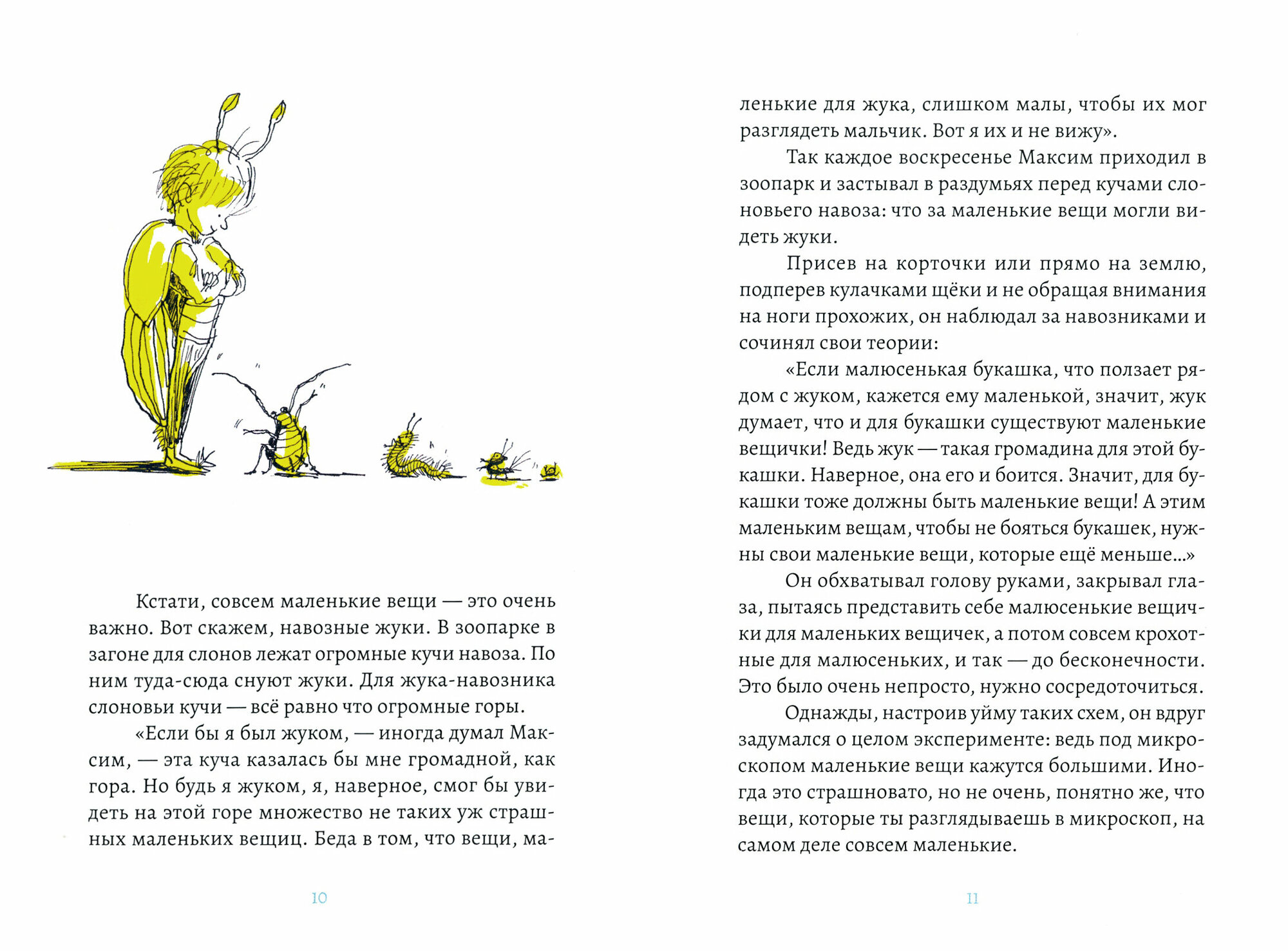 Дети старше 6 лет, на которых рассчитана данная книга, могут придумать мир, в котором им будет удобно существовать. У Максима это был мир маленьких вещей. Он не мог запомнить путь до школы, потому что его внимание было приковано к паучку у лампочки на лестничной клетке, маленькому ростку, пробивавшемуся сквозь асфальт, зубу старичка у метро, стайке муравьёв, а там уже появлялась школа. Ему было комфортно в этом мире, потому что всё большое было необъятным и пугающим.
