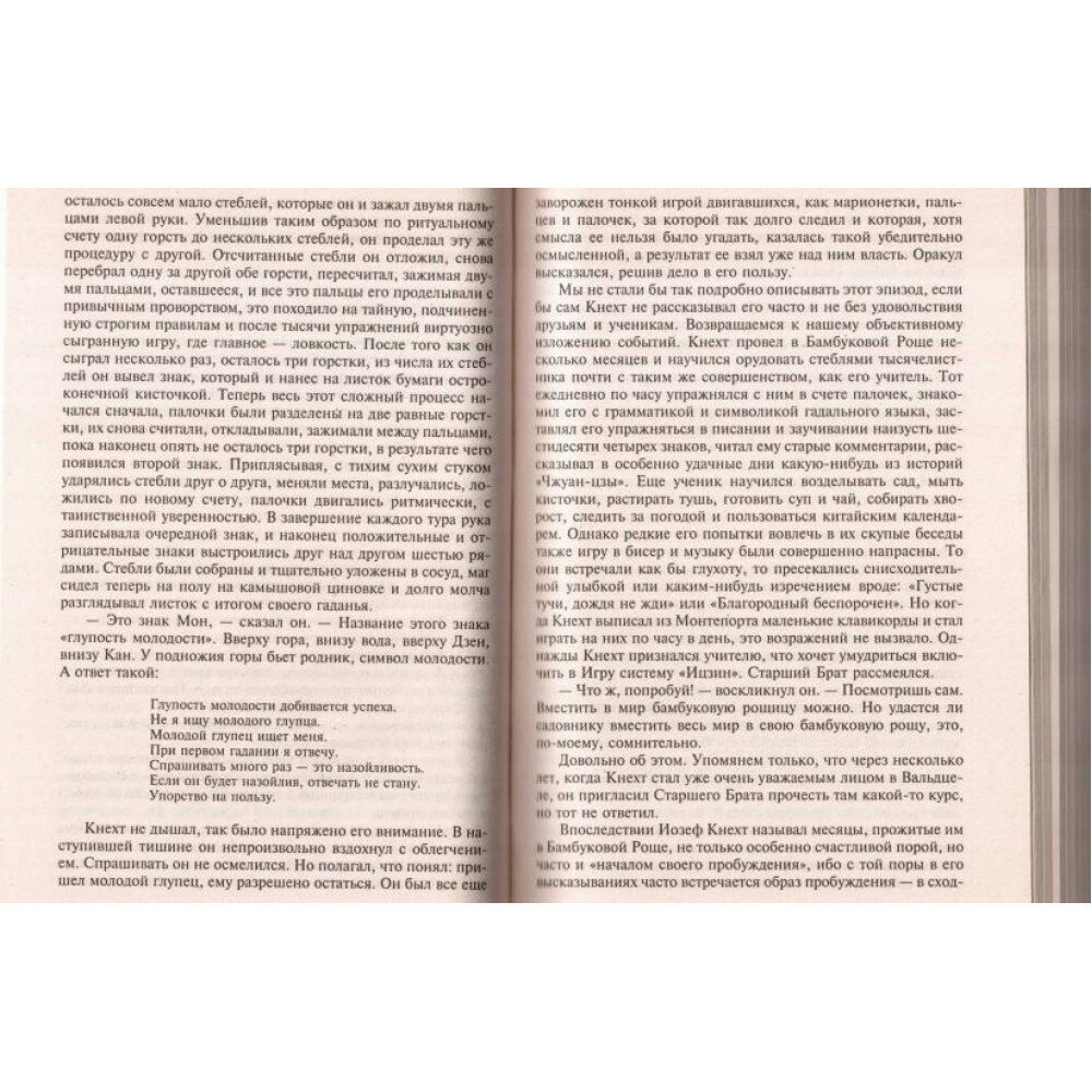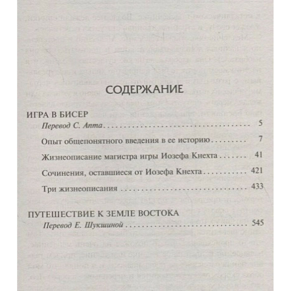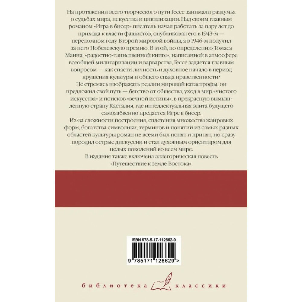 "Игра в бисер" - один из самых сложных и знаковых романов двадцатого века, ставший вершиной творчества Германа Гессе, получившего за него Нобелевскую премию по литературе. Действие романа происходит в будущем, где духовная элита человечества пытается посредством Игры в бисер сохранить все достижения мировой культуры, наук и искусств, сочетая их неисчерпаемые смыслы, проводя параллели, играя с ними, но не занимаясь новым творчеством. Главный герой, ставший Магистром Игры Иозеф Кнехт, принимает решение сложить с себя полномочия и вернуться в мир. В книгу также входит мистическая повесть "Путешествие к земле Востока".