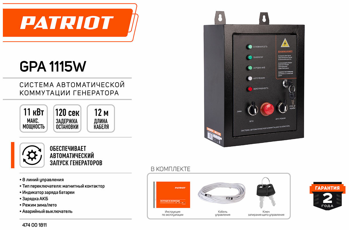 Система автоматической коммутации PATRIOT 474001811 обеспечивает автоматический запуск генераторов PATRIOT GP 6510AE, GP7210AE, GP8210AE, GP9510AE в случае падения напряжения в основной сети или прекращения подачи электроэнергии. Когда подача электричества возобновляется, система отключает генератор. Максимальная мощность до 11 кВт.