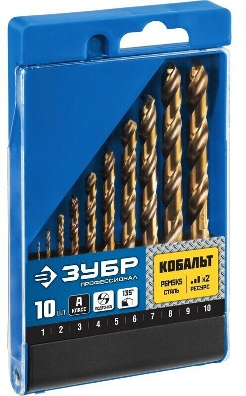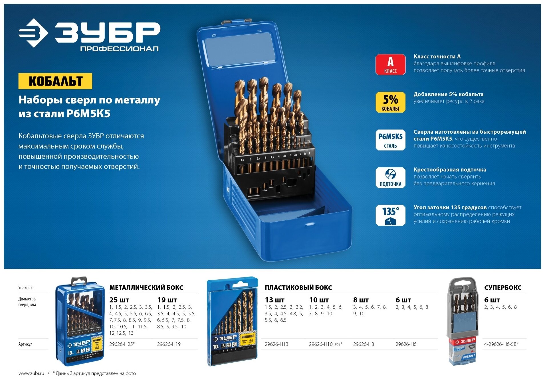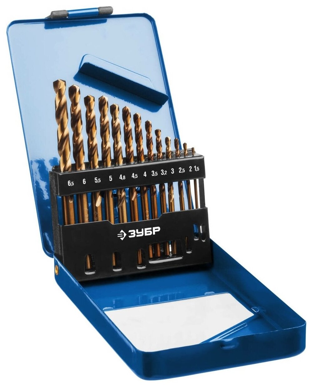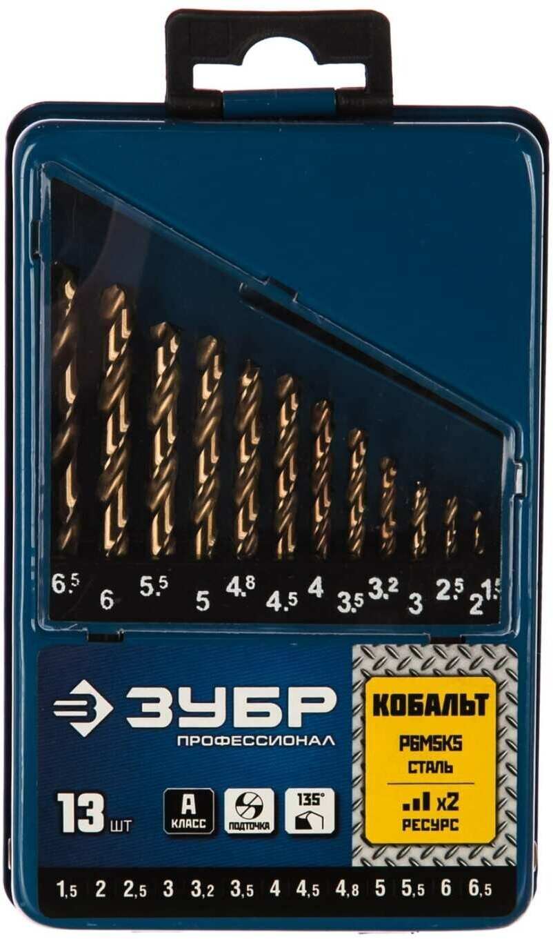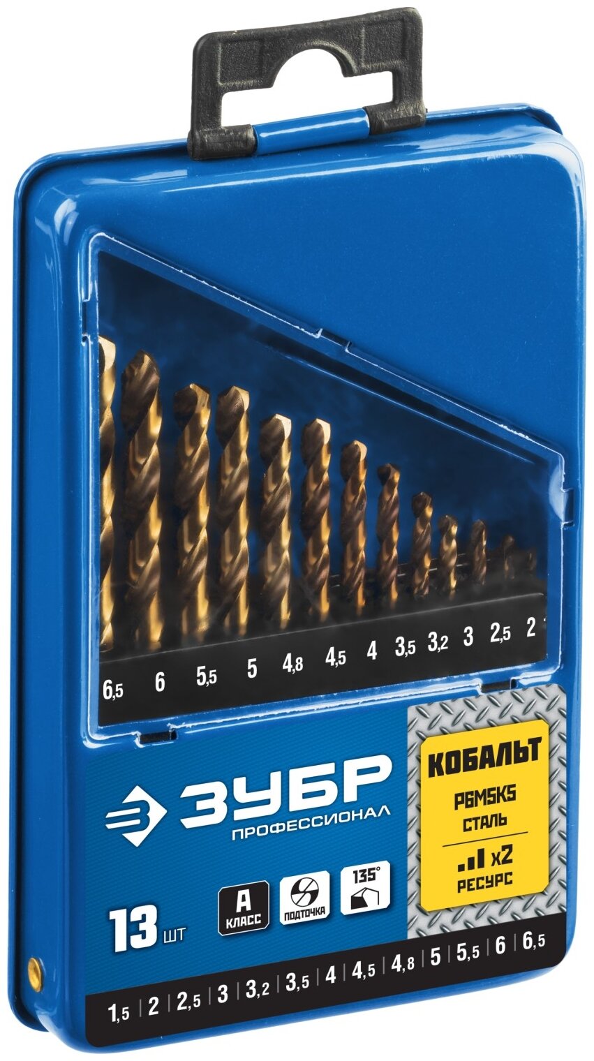 ЗУБР КОБАЛЬТ 13шт(1.5-6.5мм), Набор сверл по металлу, сталь Р6М5К5, класс А, мет.бокс