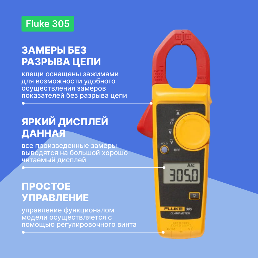 Токоизмерительные клещи Fluke 305 – отличный выбор для специалиста-электрика, которому нужны точные, быстрые и надежные измерения нескольких характеристик цепи, ведь они совмещают в одном корпусе четыре инструмента (амперметр, вольтметр, оммметр, а также тестер сети).Токоизмерительные клещи Fluke 305 представляют собой легкий, компактный многофункциональный инструмент для повседневной диагностики и технического обслуживания электрических сетей. Этот прибор позволяет измерить силу переменного тока до 999А, что является самым лучшим показателем в линейке токовых клещей начального уровня Fluke 300. Также прибор позволяет определить напряжение постоянного и переменного тока в диапазонах 400 и 600В, измерить сопротивление и осуществлять диагностику целостности электрической цепи.Работа с Fluke 305 не требует специальных навыков и не вызовет никаких трудностей даже при отсутствии у оператора опыта работы с токоизмерительными клещами. Это бесконтактный прибор, и все измерения с помощью токовых клешей не потребуют прерывания питания цепи. Эргономичный корпус инструмента обеспечивает надежный захват, прибор удобно лежит в ладони, и все измерения могут выполняться одной рукой. Данные измерений отображаются на контрастном жидкокристаллическом дисплее с подсветкой для работы при любом освещении.Токовые клещи Fluke 305 имеют категорию электробезопасности "III 600В" - им не страшны перепады напряжения в диапазоне 600В. Благодаря такой надежной защите клещи прибор может применяться в трехфазном энергоснабжении, в однофазных линиях освещения, линиях питания и коротких отводах, щитовых шкафах и распределительных устройствах. Питание прибора осуществляется от стандартной батарейки размера АА, и у вас не возникнет проблем с их заменой.