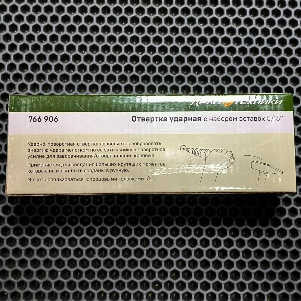 Отвертка ударная Дело Техники позволяет преобразовать энергию удара молотком по ее затыльнику в поворотное усилие для заворачивания / отворачивания крепежа. Применяется для создания больших крутящих моментов которые не могут быть созданы вручную. Технические характеристики: -материал вставок - Cr-V; -твёрдость - 52-56 HRC; -присоединительный квадрат - 1/2'' Комплектация: Отвертка; Вставки 5/16''длиной 30мм: PH2, PH3, PH4, SL8, SL10, SL12.