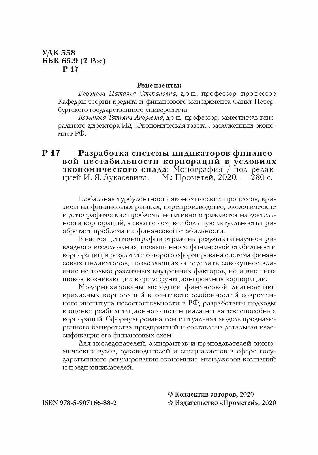 В настоящей монографии отражены результаты научно-прикладного исследования, посвященного финансовой стабильности корпораций, в результате которого сформирована система финансовых индикаторов, позволяющих определить совокупное влияние не только различных внутренних факторов, но и внешних шоков, возникающих в среде функционирования корпорации.