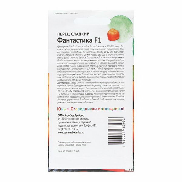 | Комплектация | Семена овощей Перец сладкий Фантастика 5 шт - 1 уп |