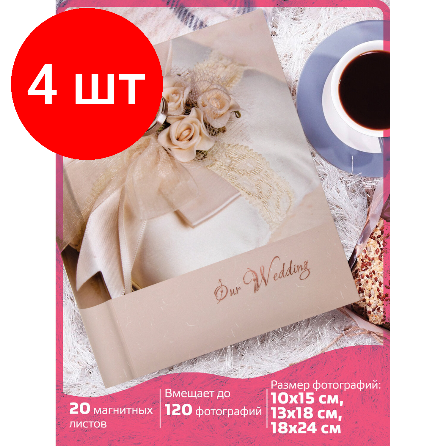 Фотоальбом BRAUBERG свадебный на 200 фотографий 10х15 см твердая обложка бокс бело-розовый 390689 Наша свадьба
