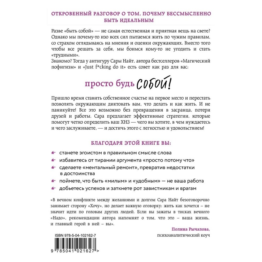 Новая книга Сары Найт, автора бестселлеров "Магический пофигизм" и "Just f*cking do it" – о том, как важно быть самим собой. Вокруг всегда полно советчиков: родственников, знакомых, коллег, – которые "любезно" объясняют, как нам жить и что делать, попутно убеждая задвинуть подальше наши "странности". Сара предлагает эффективные стратегии, которые помогут определиться с ХНЗ – тем, чего вы хотите, в чем нуждаетесь и чего заслуживаете на самом деле, – и научиться строить жизнь по собственным правилам, превращая свои недостатки в достоинства. А главное, помните: если вы не будете собой, вы просто станете... никем!