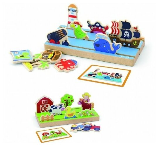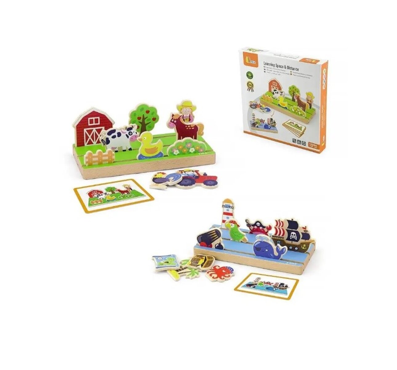 Игровой набор представляет собой подставку с фигурками на темы море и ферма. Он поможет освоить ребенку понятия дальше и ближе связанные с расстоянием и пространством.