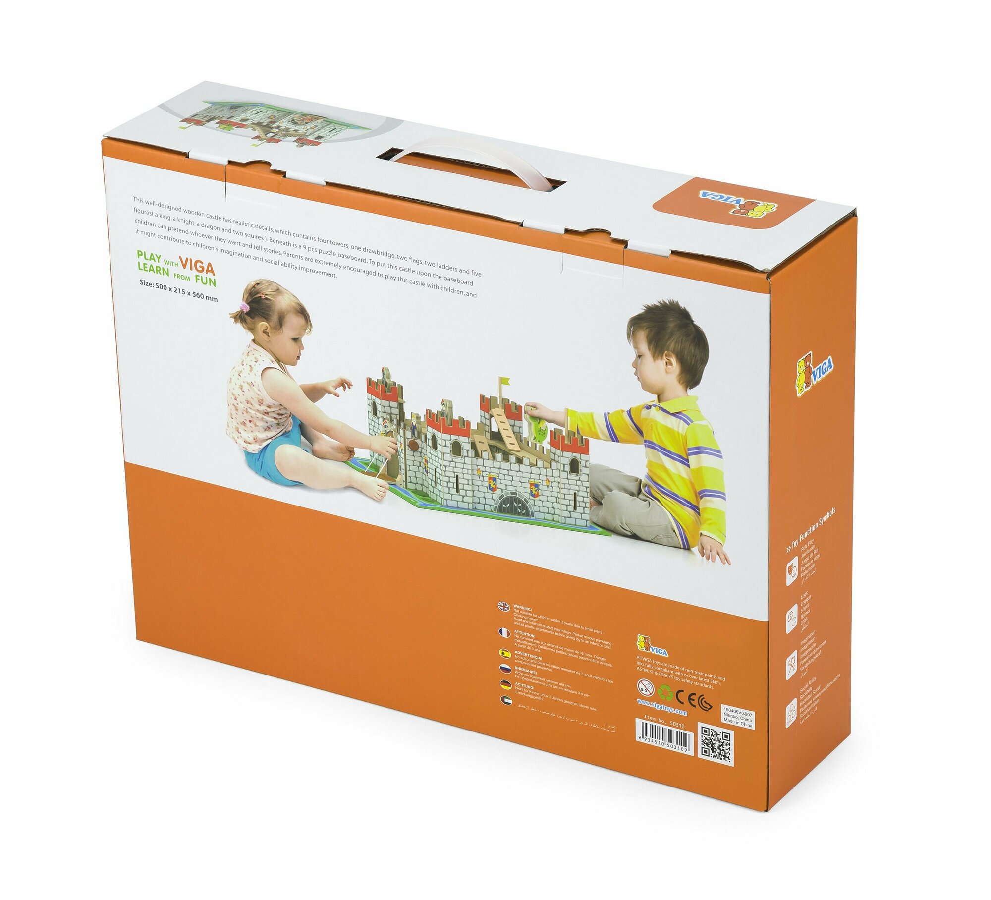 Этот хорошо спроектированный деревянный замок с реалистичными деталями. Набор содержит: четыре башни, один разводной мост, два флага, две лестницы и пять фигурок для игры (король, рыцарь, дракон и два оруженосца). Замок стоит на основе-пазле из 9 элементов.