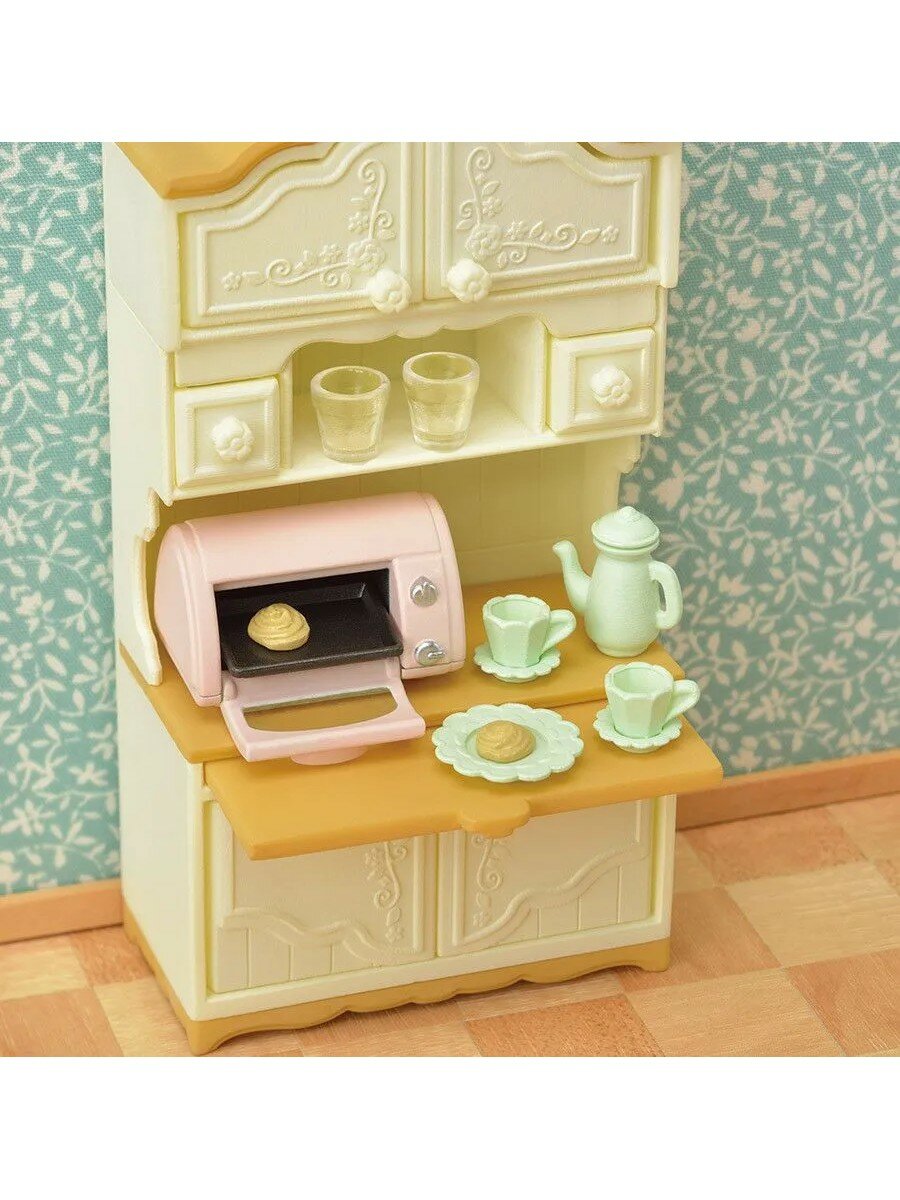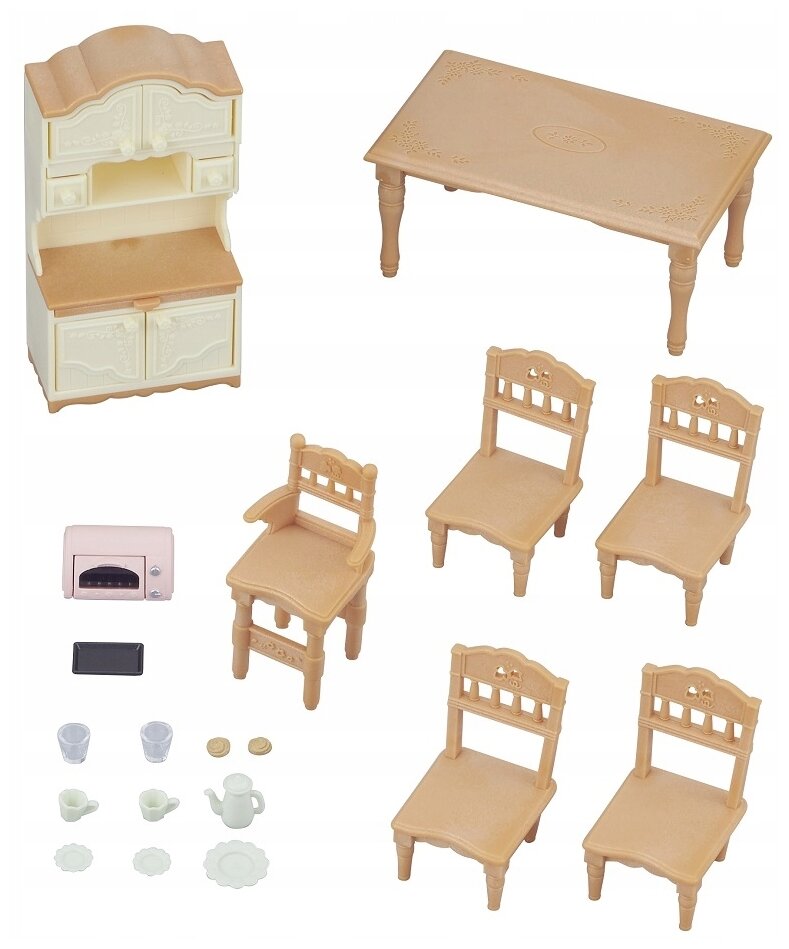 Sylvanian Families С набором Sylvanian Families «Обеденная комната» каждая семья сможет отлично провести время. Обеденный зал выполнен в деревенском стиле, поэтому в нем очень уютно сидеть всей семьей и наслаждаться горячим чаем со сладостями. Игра станет намного увлекательнее, если вы добавите больше аксессуаров и любимых персонажей из других наборов. В набор не входят фигурки. Особенности: За столиком поместятся 5 героев: 4 взрослых персонажа на обычных стульях и 1 малыш на стульчике для ребенка. Игровой набор подходит для девочек и мальчиков дошкольного и младшего школьного возраста – от 3 лет и старше. В кухонном шкафу выдвигаются ящички, открываются дверцы и убирается столешница. Игры с набором отлично развивают воображение, творческое мышление и фантазию. В комплекте: Обеденный стол. 5 стульев. Кухонный шкаф. Тостер. 2 ящика. 2 печенья. 2 стакана. 2 блюдца. 2 чашки. Кастрюля. Крышка. Тарелка. Поднос для тостера.