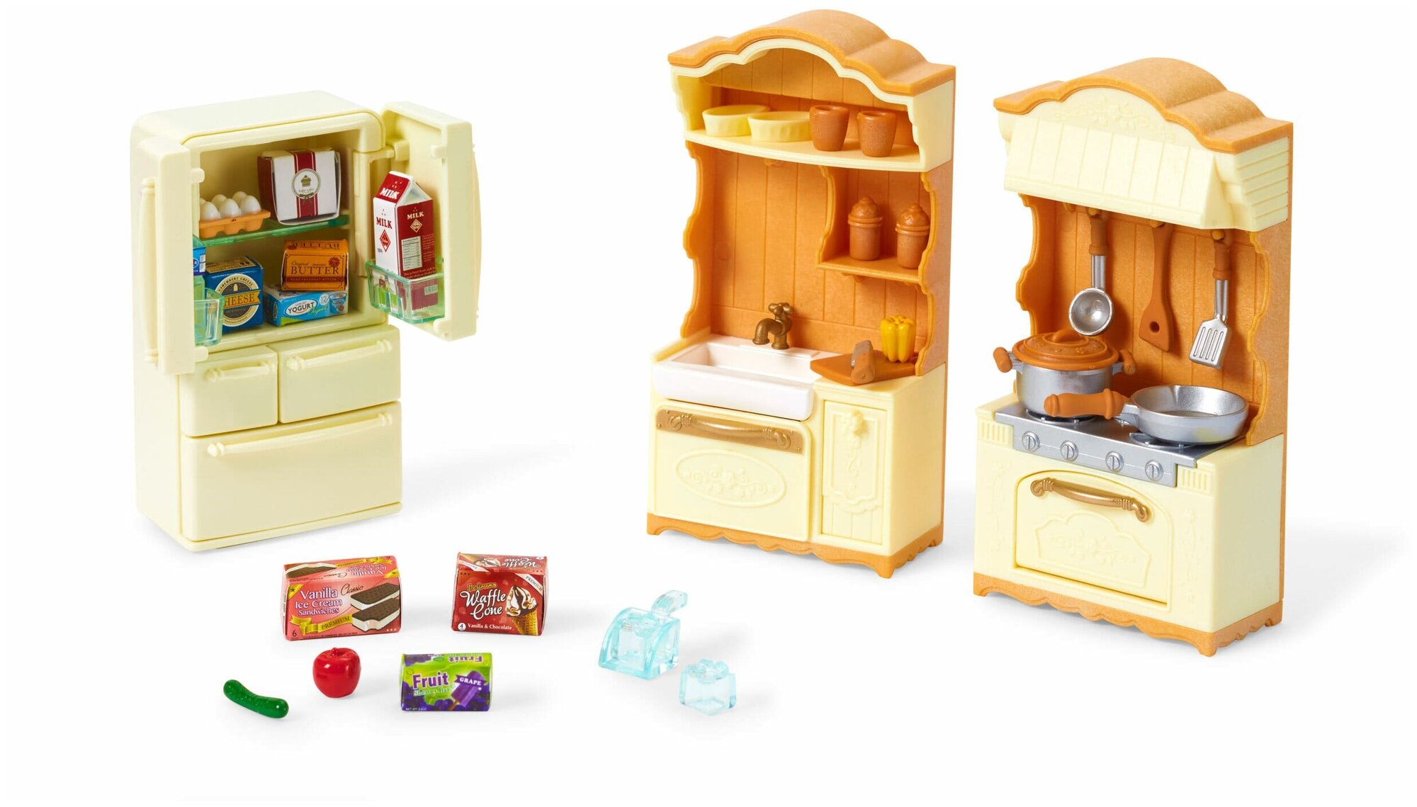 Sylvanian Families Обустраивайте игрушечный домик вместе с набором Sylvanian Families «». Просторная оборудованная кухня разнообразит любую творческую игру. Фигурки не входят в набор и приобретаются отдельно. Особенности: Игровой набор развивает воображение, фантазию, творческое мышление. Игровой набор подойдет мальчикам и девочкам дошкольного и младшего школьного возраста – от 3 лет. Кухонные принадлежности можно разместить на полках гарнитура, а продукты – в отделениях холодильника. Совместим с набором 5302 "Большой дом со светом". В комплекте: Раковина. Плита. Место для хранения продуктов. Кастрюля с крышкой. Сковорода. Ковш. Лопатка. Разделочная доска. Деревянная лопаточка. 7 бумажных пакетов. Коробка молока. Пластиковая бутылка. 2 кубика льда. Огурец. Паприка. Совок для льда. Яблоко. Выдвижные ящики. 2 контейнера для приправ с крышками. Кухонный нож. 2 чашки. 2 формы для выпечки. Холодильник.