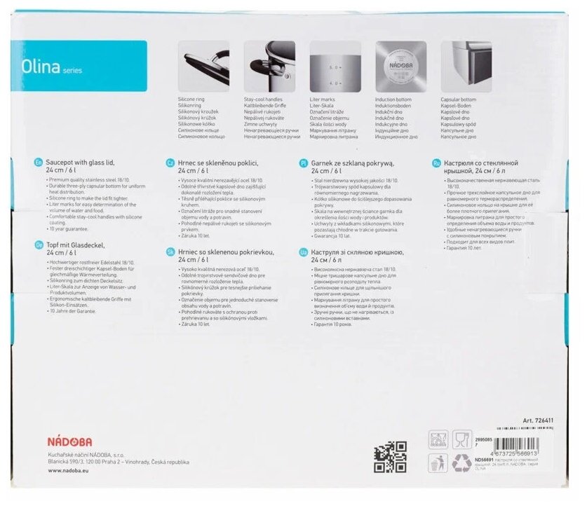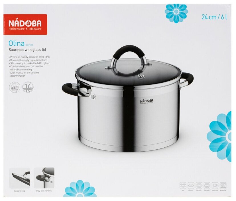 Nadoba OLINA - это восхитительная кастрюля, изготовленная из высококачественной нержавеющей стали. Она предназначена для приготовления пищи на любых поверхностях плит. Одно из главных преимуществ данной модели - трехслойное капсульное дно для быстрого и равномерного разогревания пищи. Крышка кастрюли изготовлена из закаленного стекла, оснащенная отверстием для выпуска пара. Диаметр кастрюли составляет 20 см, а объем - 3,2 литра.