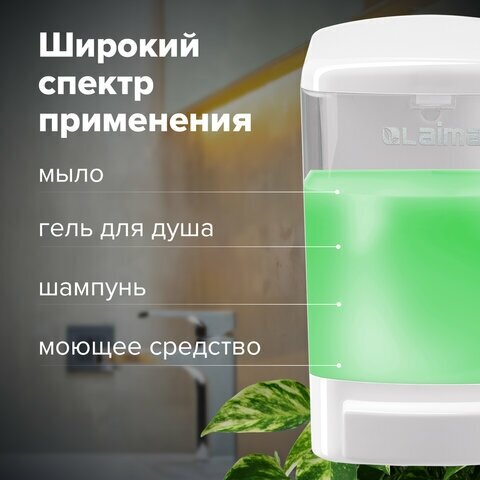 Дозатор для жидкого мыла LAIMA подходит для использования в местах с любой проходимостью, таких как туалетная комната в ресторане, офисе, торговом центре, аэропорту, вокзале и т. д.Пластиковый дозатор подходит для жидкого мыла от любого производителя. Управление механическое. Надежное в использовании устройство не требует специального ухода. Достаточно протирать корпус по мере необходимости. Обеспечивает соблюдение правил гигиены в общественных местах и дома. За счет наличия прозрачного окна на корпусе дозатора удается легко контролировать количество средства в нем. При нажатии кнопки на лицевой части диспенсера выделяется рассчитанная на однократное применение порция мыла. В комплекте предусмотрены крепежные элементы. Объем - 1 литр.Удобство в использовании и практичность - вот что отличает дозатор для жидкого мыла LAIMA. Не упустите возможность приобрести в нашем интернет-магазине!Обзоры 1 Какие виды дозаторов для жидкого мыла бывают? Какой принцип работы у диспенсера для мыла?Соблюдать правила гигиены необходимо не только дома, но и в общественных организациях. Одним из главных условий является - мытье рук. Поэтому сейчас высоким спросом пользуется жидкое мыло и диспенсер.Какие виды устройств бывают?Какой дозатор для жидкого мыла лучше выбрать?Читайте в этом материалеПодробнееОбъем - 1 л. Тип диспенсера - наливной для жидкого мыла. Артикул - . Серия - EASY_2. Диспенсерная система - нет. Управление - механическое. Индикаторы - окно для контроля уровня мыла. Комплектация - крепежные материалы. Количество режимов дозирования - 1. Сочетается с расходными материалами других производителей - да. Материал замка - нет. Материал корпуса - пластик. Цвет корпуса - белый. Ширина - 115 мм. Высота - 200 мм. Глубина - 118 мм. Производитель - Китай Вес с упаковкой - 437 г Размер в упаковке - 11.5x20.2x12 см