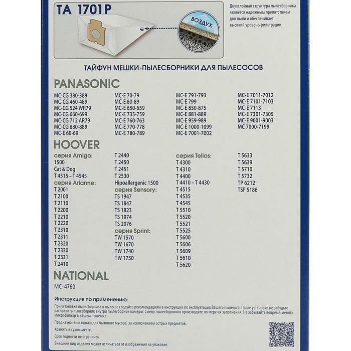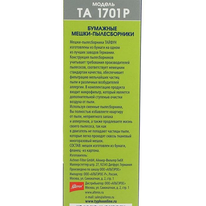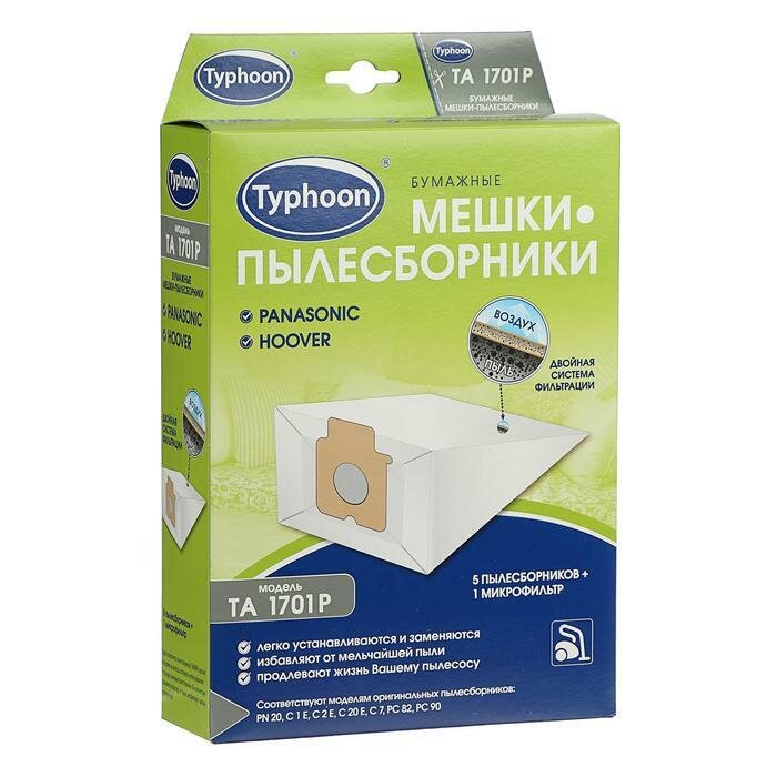 Пылесборники Тайфун 1701P для пылесосов изготовлены в Германии в полном соответствии со стандартами производителей пылесосов из специальной многослойной отбеленной бумаги. В комплект входят 5 пылесборников и 1 микрофильтр.