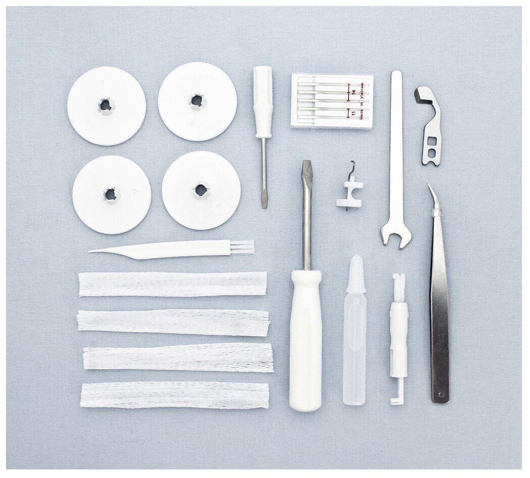| Комплект поставки | педаль; инструкция; мусоросборник; отвертка большая; отвертка малая; пинцет; гаечный ключ; нитевдеватель для машин; масло; набор игл; запасной нож; держатели катушки, - 4 шт; сетки для катушек, - 4 шт; щеточка; конвертер для работы в режиме 2-х ниточного шва |