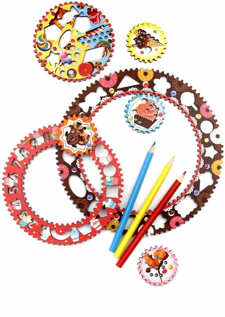 Рисоватор – многофункциональная высокоинтеллектуальная деревянная развивающая игрушка для рисования, деревянная модификация популярной игрушки Спирограф. Рисоватор имеет яркое оформление с тематическими изображениями, состоит из 2 зубчатых колес с фигурными трафаретами для рисования и 5 кругов-шестеренок. Использовать рисоватор очень просто. На листе бумаги расположите зубчатое колесо рисоватора, в него поместите один круг. В одном из отверстий круга зафиксируйте кончик пишущего предмета (ручка, карандаш, фломастер и т.д.) и начните совершать вращательные движения рукой. На бумаге появится спиралевидный узор. Используя различные пишущие принадлежности и отверстия кругов, можно получить бесконечное множество замечательных рисунков. Занятия с рисоватором развивают внимание, память, мышление, тренируют координацию движения и моторику рук, воспитывают терпение, усидчивость, любознательность и познавательную активность. Деревянный Рисоватор благотворно влияет на формирование творческих способностей малыша, и, несомненно, станет любимой игрушкой юного художника.