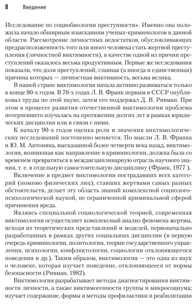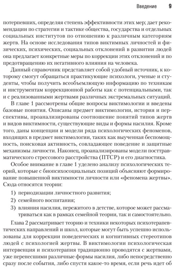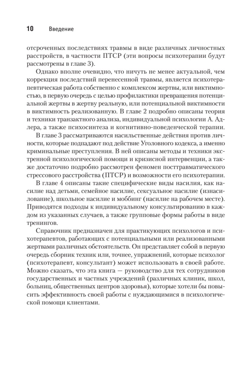 Во втором издании книги (предыдущее вышло в 2010 г.) рассмотрены предмет, история и перспективы виктимологии, а также существующие виды и формы насилия. Особое внимание уделяется анализу формирования повышенной виктимности личности, или «феномена жертвы». Также рассмотрены различные ситуации, попадая в которые человек становится жертвой, а именно: криминальные преступления; такие специфические виды насилия, как насилие над детьми, семейное насилие, сексуальное насилие (изнасилование), школьное насилие и насилие нерабочем месте. Проанализирована виктимология аддиктивного поведения. Описаны подходы к индивидуальному консультированию в каждом из указанных случаев, а также групповые формы работы в виде тренингов. Издание адресовано практикующим психологам и психотерапевтам, работающим с латентными или реализованными жертвами различных обстоятельств. Книга ценна прежде всего подборкой техник, которые специалист может использовать в практической работе.