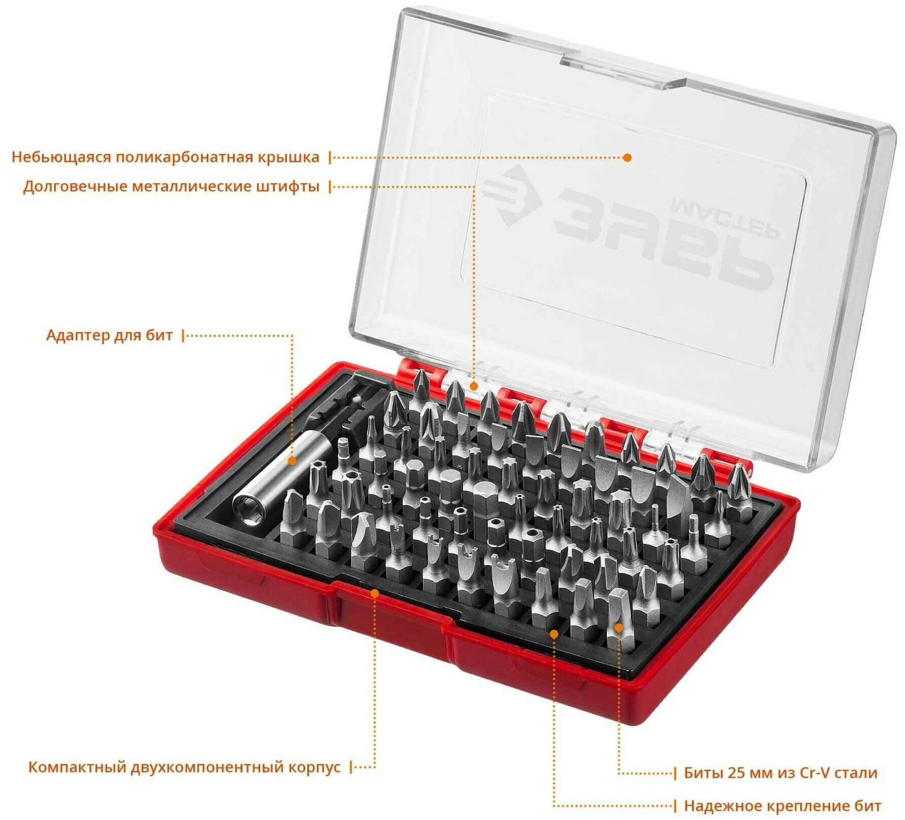| Прочие особенности и свойства | Преимущества: Высококачественная легированная хромованадиевая сталь обеспечивает высокую меха-ническую прочность. Точная геометрия шлицов обеспечивает точную посадку в крепеже. Адаптер с магнитным держателем обеспечивает быструю и надежную фиксацию насадки. Эргономичный пластиковый кейс для удобного хранения и переноски. Применение: Профессиональные биты ЗУБР для ручного и механизированного инструмента изготовлены из высококачественной стали и имеют точную геометрию шлицов, что обеспечивает длительный срок службы. - Материал держателя |