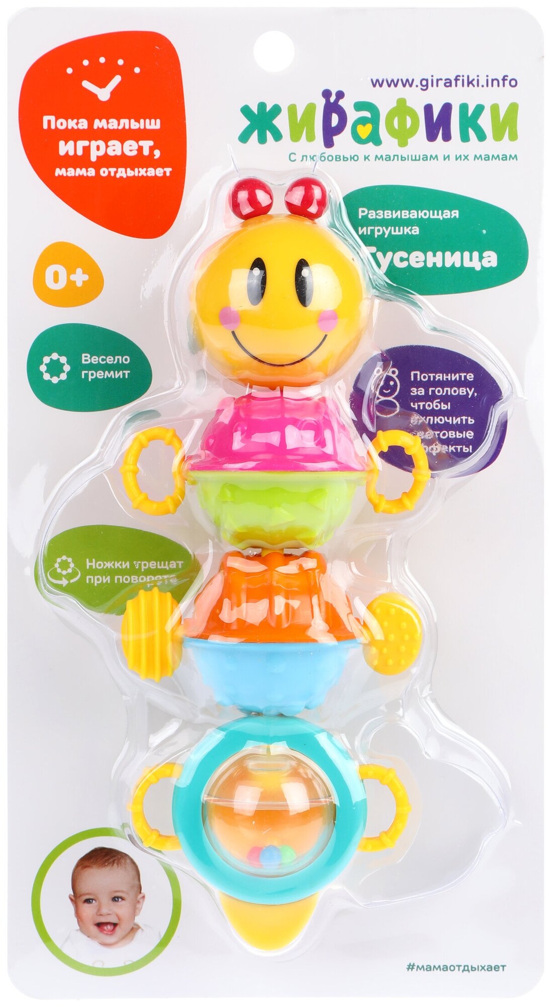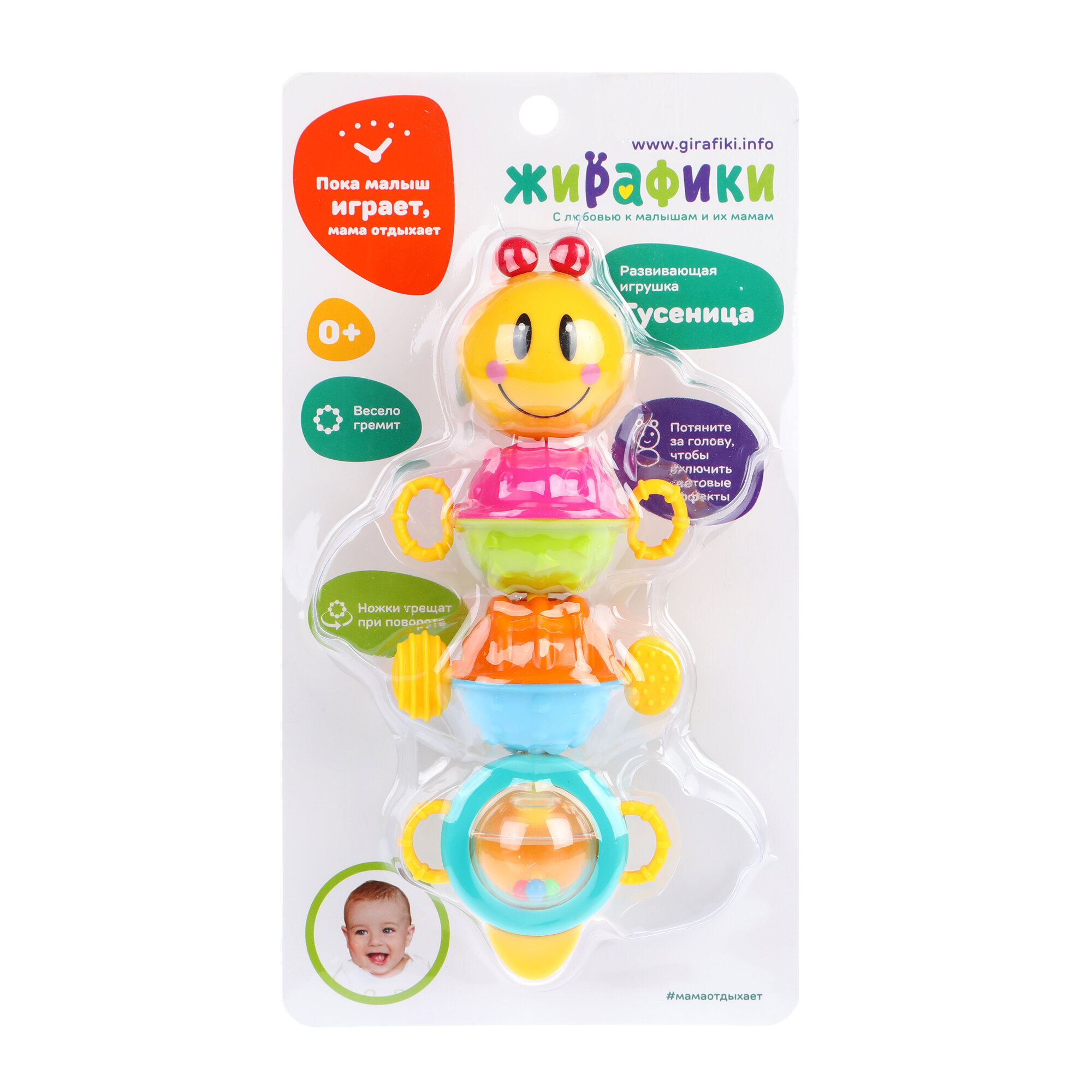 Погремушка-трещотка «Гусеница» с подсветкой надолго станет одной из самых любимых игрушек малыша! Яркие, выполненные в насыщенной цветовой гамме фактурные сегменты туловища гусенички можно поворачивать по кругу в разные стороны. Если покрутить ножки гусеницы, послышится весёлый трескучий звук, а если потянуть её за голову, включатся световые эффекты. Внутри одного из сегментов с прозрачным окошком расположены разноцветные шарики, которые очень приятно гремят при встряхивании. С помощью этой забавной гусенички кроха научится различать цвета и крепко держать погремушку в своей маленькой ручке, потренирует мелкую моторику и способность концентрировать внимание.Световыеэффекты работают от 2-х батареек типа AG13 (входят в комплект). Перед игрой необходимо удалить картонную заглушку, расположенную на обратной стороне головы гусеницы.Размер игрушки (ДхШ) составляет 21х8 см. Изделие изготовлено из высококачественной пластмассы.Рекомендованный возраст: 0 месяцев +