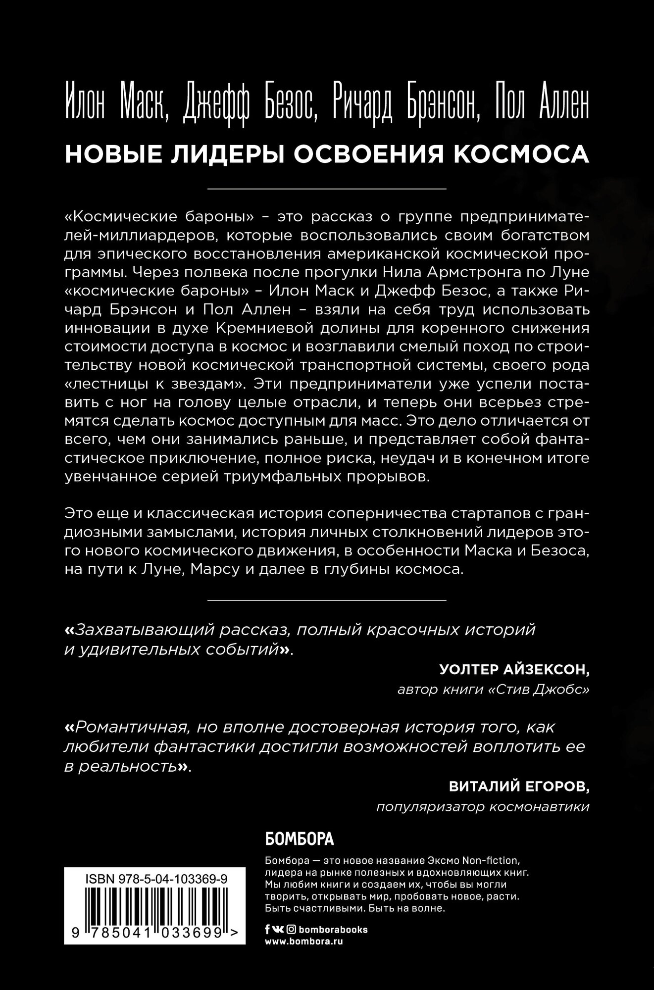 Через полвека после прогулки Нила Армстронга по Луне «космические бароны» - Илон Маск и Джефф Безос, а также Ричард Брэнсон и Пол Аллен, - взяли на себя труд использовать инновации в духе Кремниевой долины для коренного снижения стоимости доступа в космос и возглавили смелый поход по строительству новой космической транспортной системы, своего рода «лестницы к звездам». Эти предприниматели уже успели поставить с ног на голову целые отрасли, и теперь они всерьез стремятся сделать космос доступным для масс. Это дело отличается от всего, чем они занимались раньше, и представляет собой фантастическое приключение, полное риска, неудач и в конечном итоге увенчанное серией триумфальных прорывов.