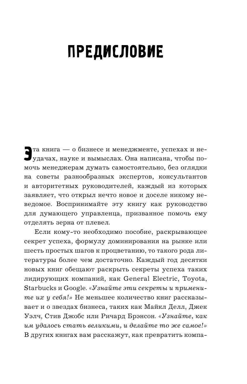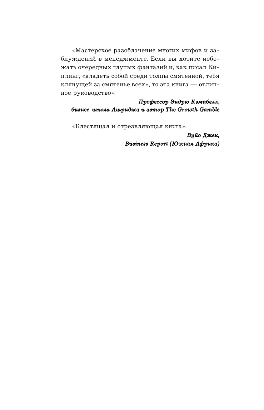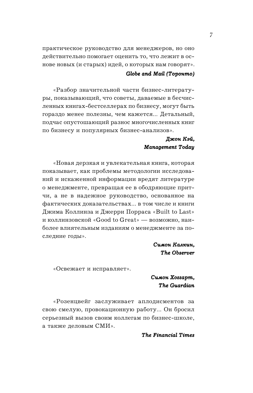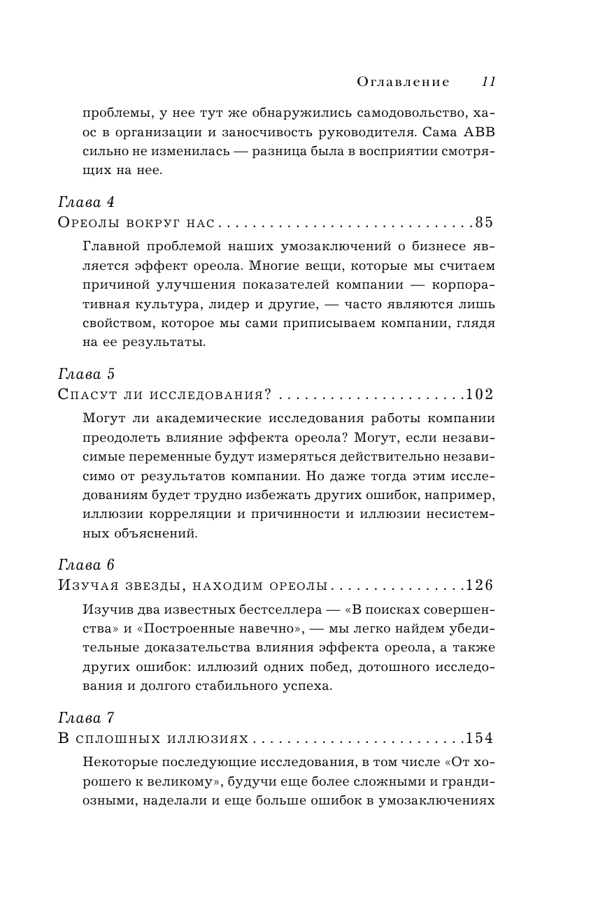 Автор книги утверждает, что наиболее популярные идеи в бизнесе не что иное, как успокоительные банальности, обещающие обеспокоенным менеджерам быстрый успех. Эти "бизнес иллюзии": общепринятые и глубоко укоренившиеся убеждения являются результатом "эффекта ореола", или, говоря иначе, нашей потребности приписывать исключительно положительные качества любой компании, достигшей успеха. Вера в эти иллюзии служит менеджерам успокоением, помогающим обосновать решения, а также позволяет значительно упрощать реальность и игнорировать постоянные требования меняющихся технологий, рынков, и потребителей.