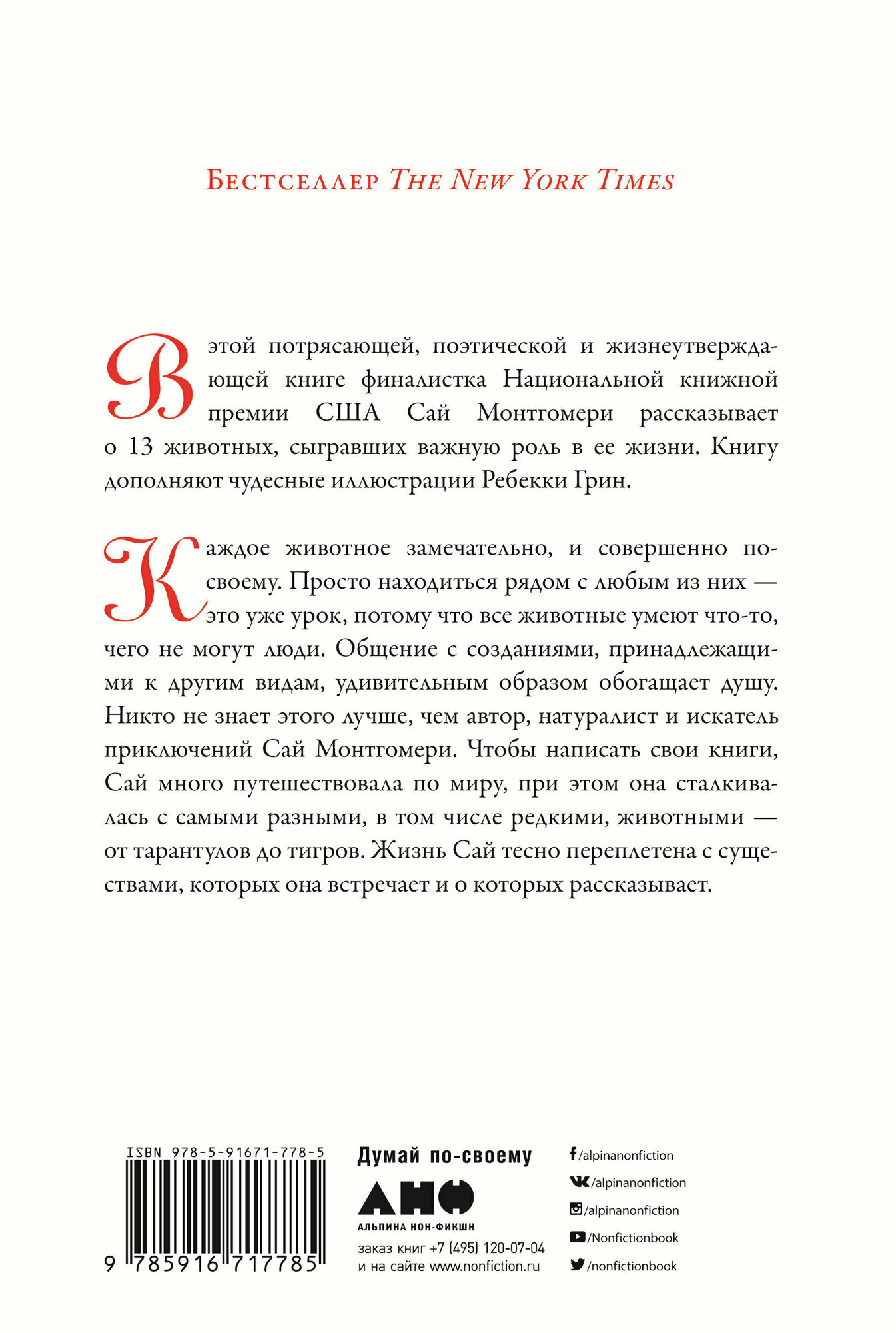 В этой потрясающей, поэтической и жизнеутверждающей книге финалистка Национальной книжной премии США Сай Монтгомери рассказывает о 13 животных — ее друзьях, сыгравших важную роль в ее жизни. Каждое животное замечательно, и совершенно по-своему. Просто находиться рядом с любым животным — это уже урок, потому что все они умеют что-то, чего не могут люди. Общение с созданиями, принадлежащими к другим видам, удивительным образом обогащает душу. Никто не знает этого лучше, чем автор, натуралист и искатель приключений Сай Монтгомери. Чтобы написать свои книги, Сай много путешествовала по миру, при этом она сталкивалась с редкими и красивейшими животными планеты — от тарантулов до тигров. Жизнь Сай постоянно пересекается с существами, которых она встречает и о которых рассказывает. Зачем читать: Автор размышляет о том, какие мы разные и сколько общего у людей и животных; как мы учимся любить и становимся чуткими; как мы находим нашу страсть; как мы создаем семьи; как справиться с потерей и отчаянием, почувствовать благодарность и заслужить прощение; и самое главное — как животные делают нас лучше, чем мы есть. Для кого: для самого широкого круга читателей.