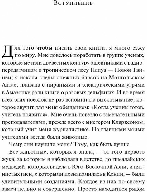 Замечательная книга! Прекрасный автор! Отличный перевод! Стыдно признаться, но я ничего слыхом не слыхивала о Сай Монтгомери и поэтому долго-долго раздумывала над приобретением этой книги - опасалась, что это какое-нибудь слащавое переливание из пустого в порожнее. Но оказалось, что автор не просто путешествующий натуралист, но она ещё обладает незаурядным писательским даром! Истории выстроены в увлекательный рассказ, прекрасный баланс юмора, читается очень легко, и в этой легкости и увлекательности очень ясно и твёрдо видна авторская позиция. Позиция серьёзная, продуманная, аргументированная. Очень хорошая книга!