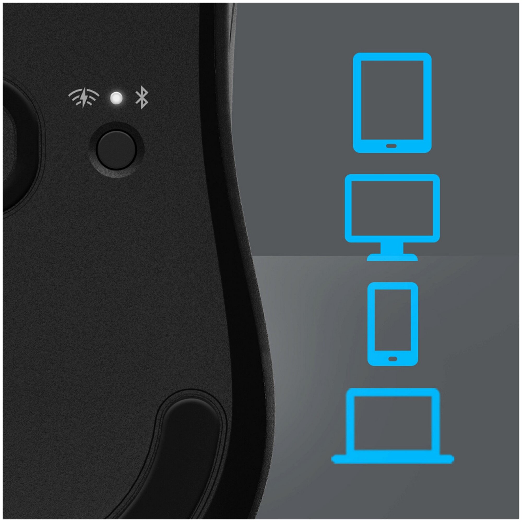 Мышка может соединяться с компьютером через USB-адаптер или передатчик Bluetooth. Это делает её совместимой с большинством настольных устройств и ноутбуков, а также с некоторыми игровыми планшетами.