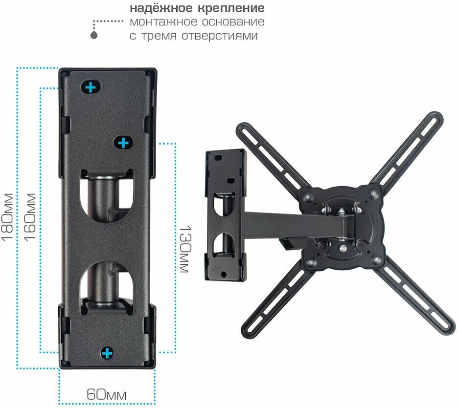 - хороший кронштейн, телевизор размером 109 см держит без напряга. хороший поворот для такой диагонали за счет длинного выдвижения. крепления к стене надежное, 3 болта ,