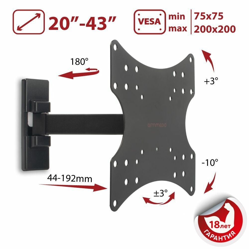 | Дополнительно | VESA 75x75/100x100/150x150/200x200,Угол поворота 90,Угол наклона +3 / -10,Диагональ экрана 20"-43",Расстояние от стены 44-192 мм,Нагрузка 20 кг |