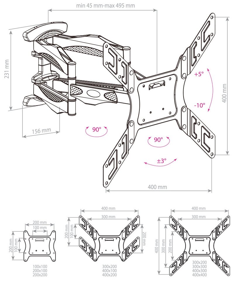 | VESA | 75х75, 100х100, 200х100, 200х200, 300х200, 300х300, 400х200, 400х300, 400х400 |