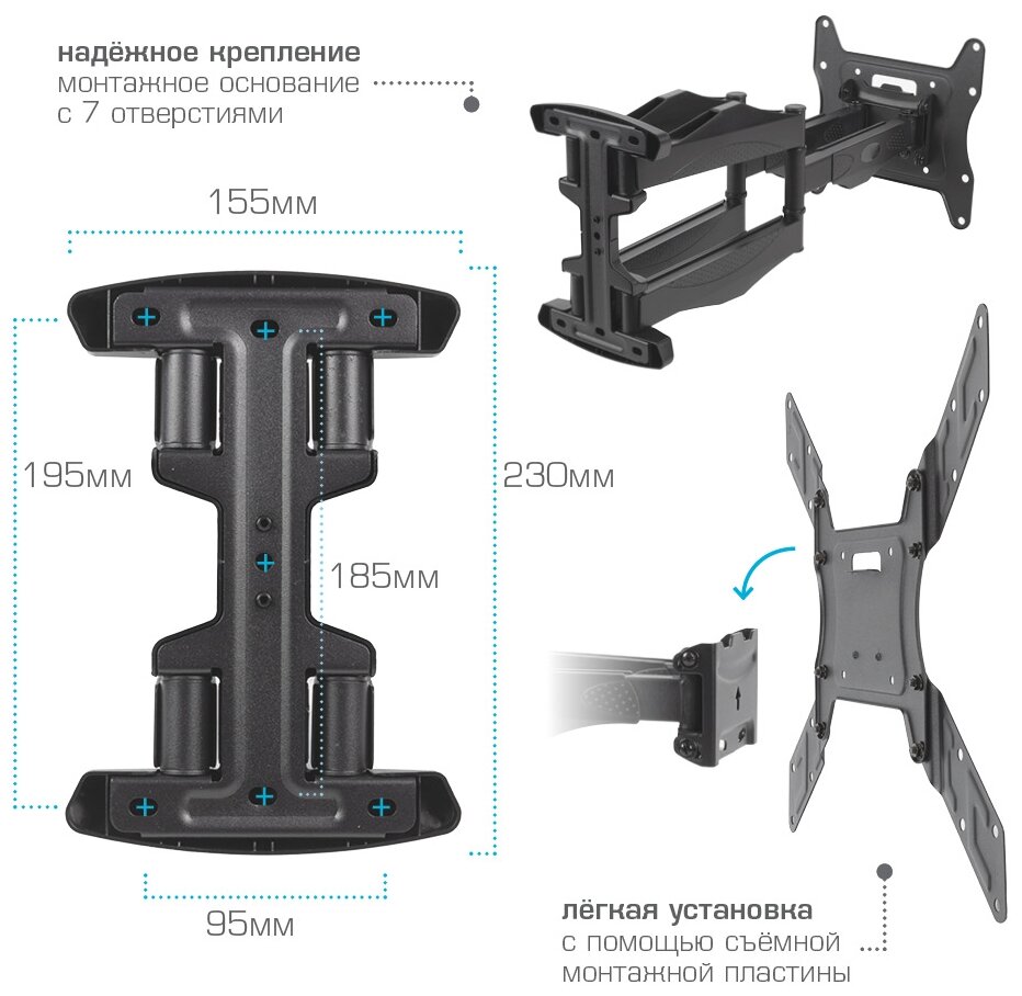 | Дополнительно | Надежная стальная конструкция Универсальный-телевизор на кронштейне можно наклонить, повернуть и сдвинуть к стене Корректировка экрана - вращение экрана в горизонтальной плоскости на ±3° Легкий монтаж телевизора - благодаря наличию съемной монтажной пластины Декоративные накладки Кабель-канал |