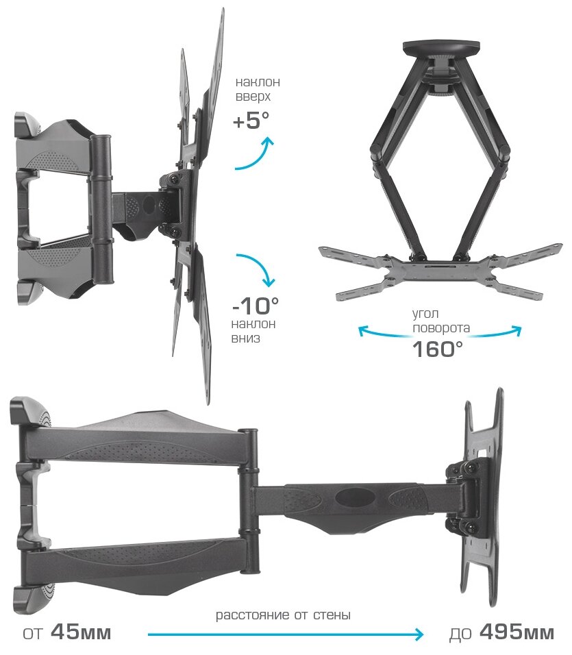 Очень понравился данный кронштейн. Куча регулировок и куча болтов для крепления к телевизору, подробный мануал. Телевизор в 55" надежно повис на стене. Двигается легко и плавно. В отличии от старого - Электриклайта - его можно смело крутить в любую сторону не боясь что где-то что-то открутится.