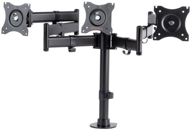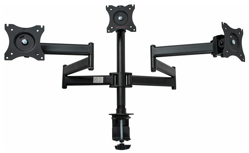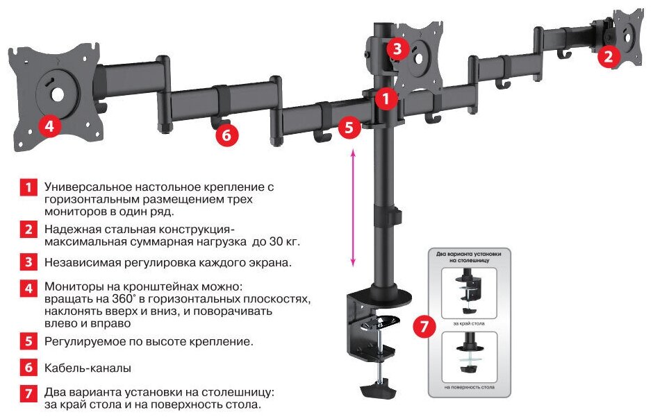 | Дополнительно | Универсальное настольное крепление с горизонтальным размещением трех мониторов в один ряд. ,Надежная стальная конструкция- максимальная суммарная нагрузка до 30 кг. ,Независимая регулировка каждого экрана. ,Мониторы на кронштейнах можно:вращать на 360° в горизонтальных плоскостях, наклонять вверх и вниз, и поворачивать влево и вправо ,Регулируемое по высоте крепление. ,Кабель-каналы ,Два варианта установки на столешницу:за край стола и на поверхность стола. |