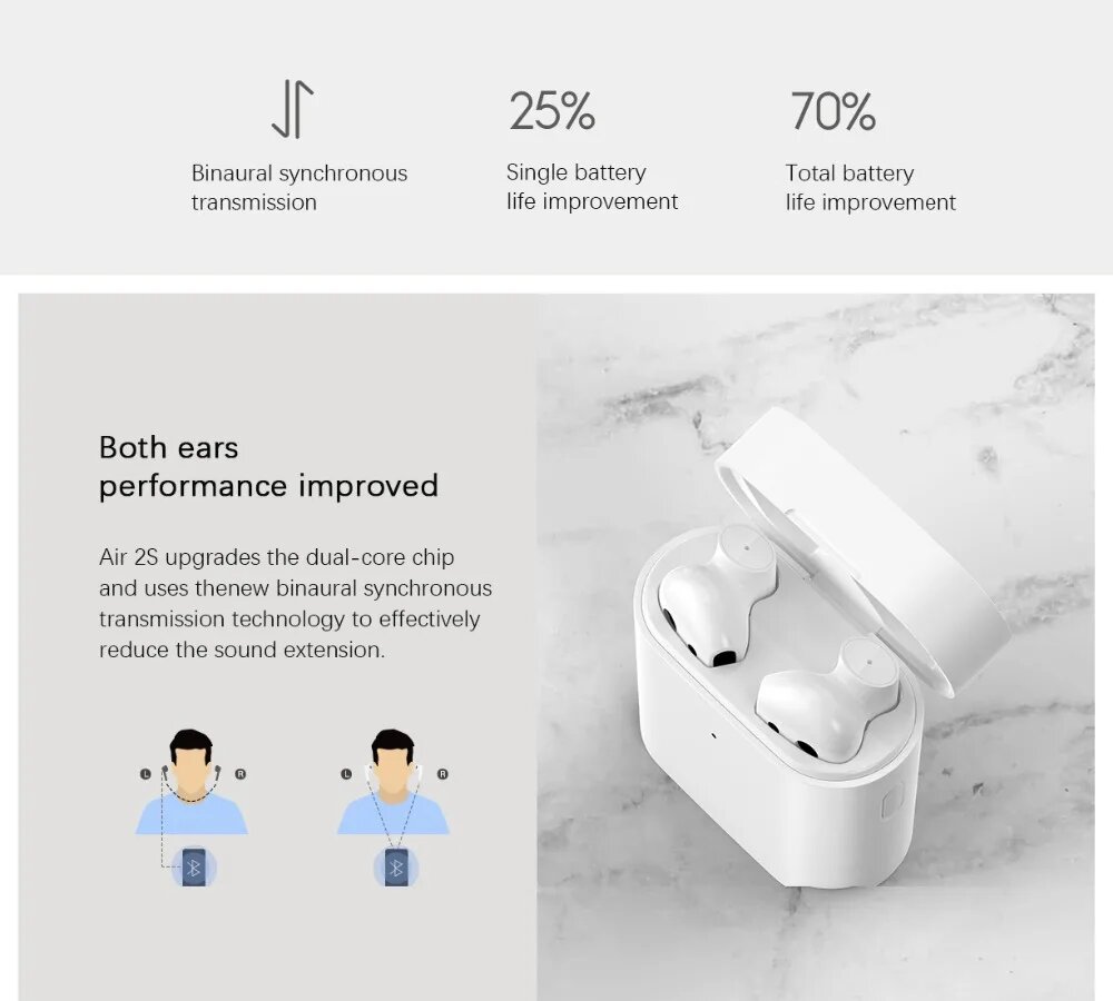 От первого поколения Xiaomi Mi AirDots новые наушники отличаются, в частности, наличием инфракрасных сенсоров, которые позволяют определять, находятся ли они в ушной раковине. Если пользователь вынимает наушники из ушей, то воспроизведение музыки автоматически ставится на паузу. Это не только очень удобно, но и позволяет существенно повысить время работы наушников без подзарядки. Mi оснащены 7-миллиметровыми динамиками с титановой диафрагмой. Кстати, наушники оснащены системой шумоподавления, что может очень пригодиться в метро или самолете.