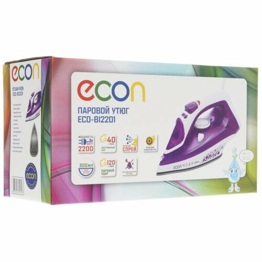 Утюг ECON – легкость и удобство использования! Противокапельная система не допускает протечку воды сквозь подошву, защищая ткань от образования пятен. Большая мощность прибора позволяет удалять любые складки на ваших вещах. Удобное управление позволит вам с легкостью пользоваться этим утюгом. Функция распыления увлажняет ткань и позволяет направить струю туда, где это необходимо. Функция вертикального отпаривания позволяет разглаживать вещи, не снимая их с вешалки.