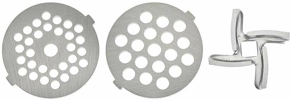 Помимо двух перфорированных дисков для фарша, в комплекте предусмотрены насадки для приготовления колбас и кеббе.