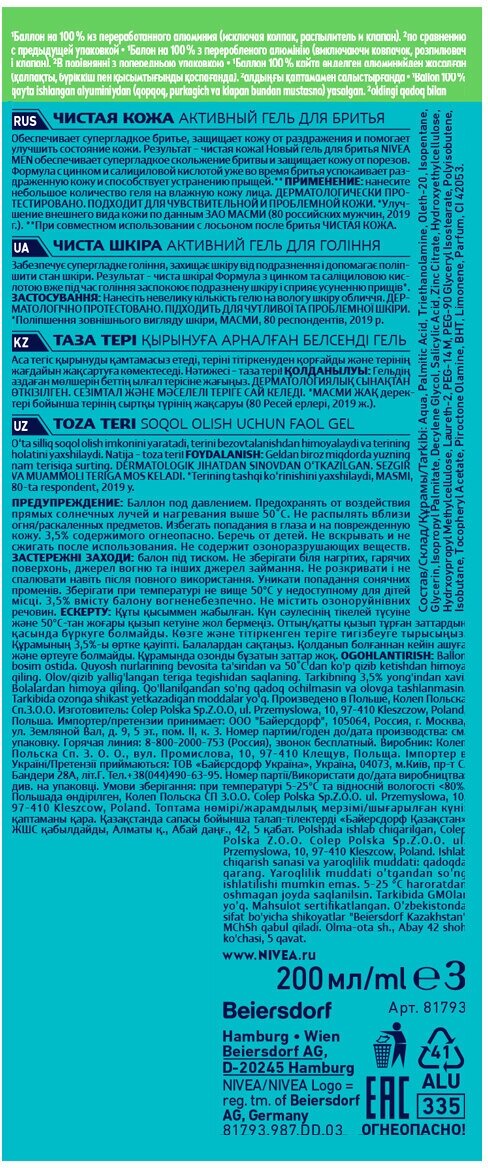 Описание товара:Активный гель для бритья "Чистая кожа" от NIVEA обеспечивает супергладкое скольжение бритвы и защищает кожу от порезов. Формула с цинком и салициловой кислотой успокаивает даже очень раздраженную кожу уже во время бритья и способствует устранению прыщей.Состав товара:Aqua, Palmitic Acid, Triethanolamine, Oleth-20, Isopentane, Glycerin, Isopropyl Palmitate, Decylene Glycol, Salicylic Acid, Zinc Citrate, Hydroxyethylcellulose, Hydrxoypropyl Methylcellulose, Laureth-2, PEG-14 M, PEG-90 Glyceryl Isostearate, Polyisobutene, Isobutane, Tocopheryl Acetate, Piroctone Olamine, BHT, Limonene, Parfum, CI 42053.Меры предосторожности:Баллон находится под давлением: может взорваться при нагревании. Держать вдали от тепла, горячих поверхностей, искр, огня и других источников возгорания. Не курить при использовании. Использованный баллон не вскрывать и не сжигать даже после полного использования. Не подвергать воздействию прямых солнечных лучей и нагреванию свыше 50°С. Избегать попадания в глаза и на раздраженную кожу. Хранить в недоступном для детей месте. Без озоноразрушающих веществ.Способ применения:Выдавите гель для бритья на ладонь. Равномерно распределите по влажной коже подбородка, щек и шее плавными круговыми движениями. Можно использовать для нанесения кисть или помазок.