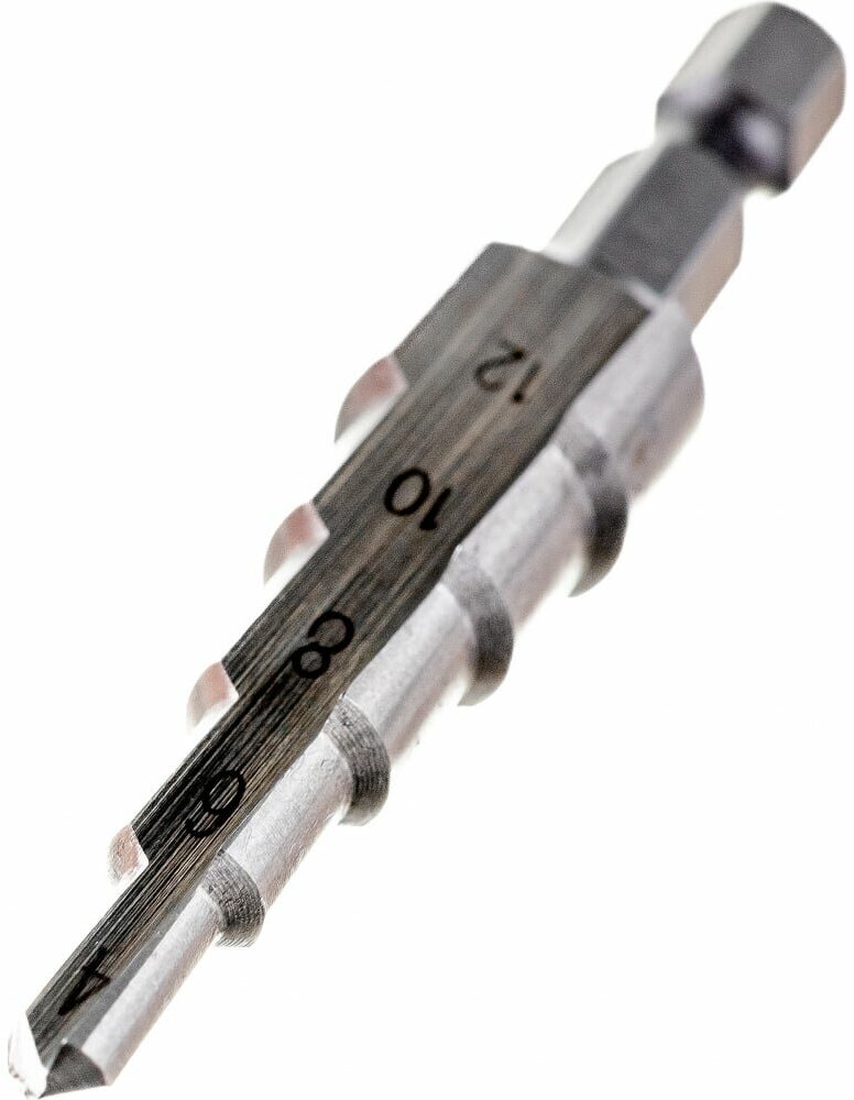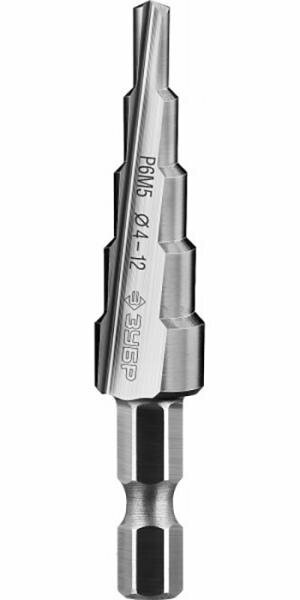 Сверло ЗУБР ступенчататое по сталям и цвет. мет. ст. Р6М5, d=4-12мм, 5ступ. d=4-6-8-10-12, L-65мм, шестигран.хвост.1/4"