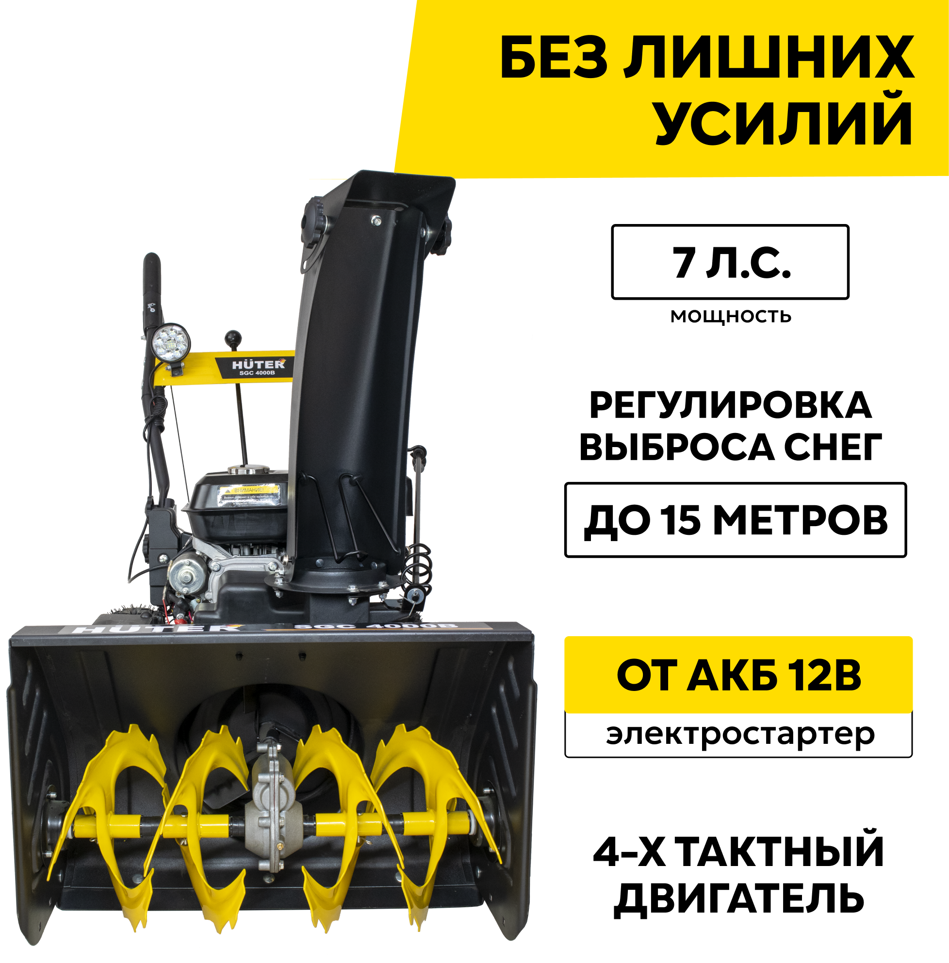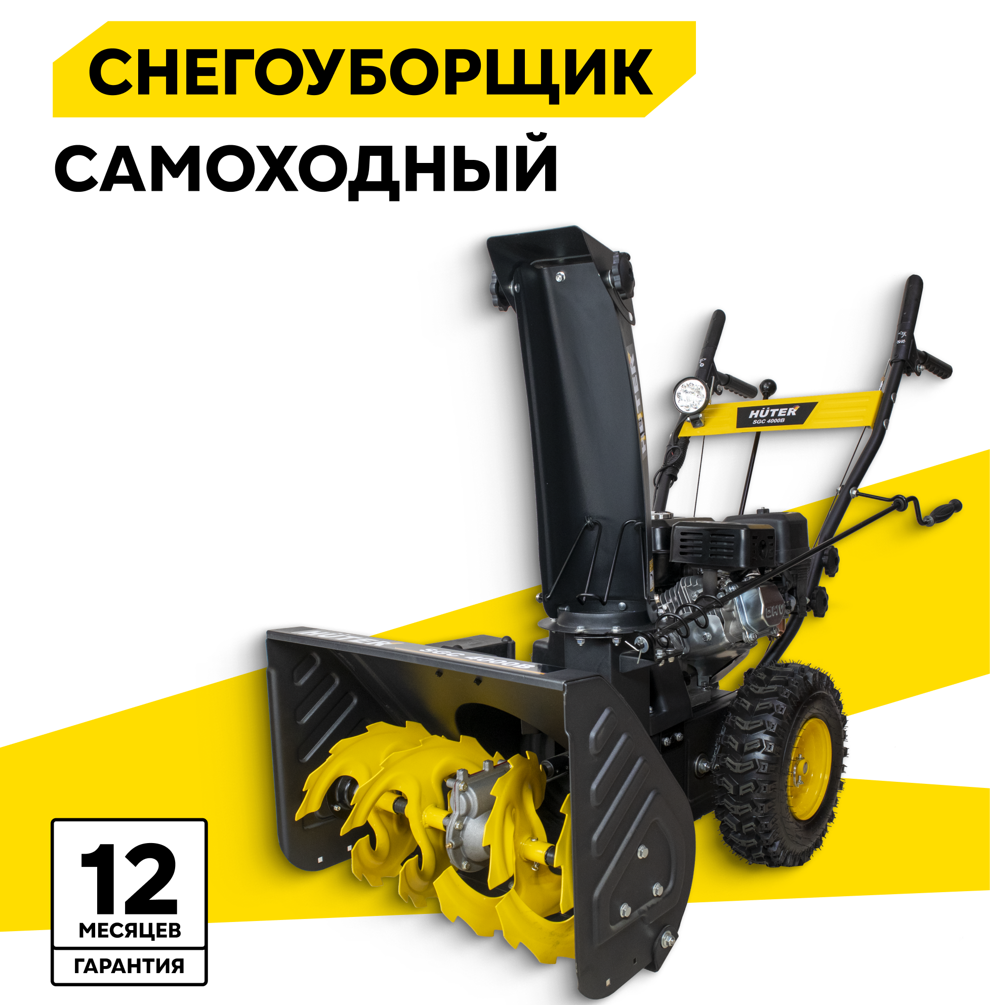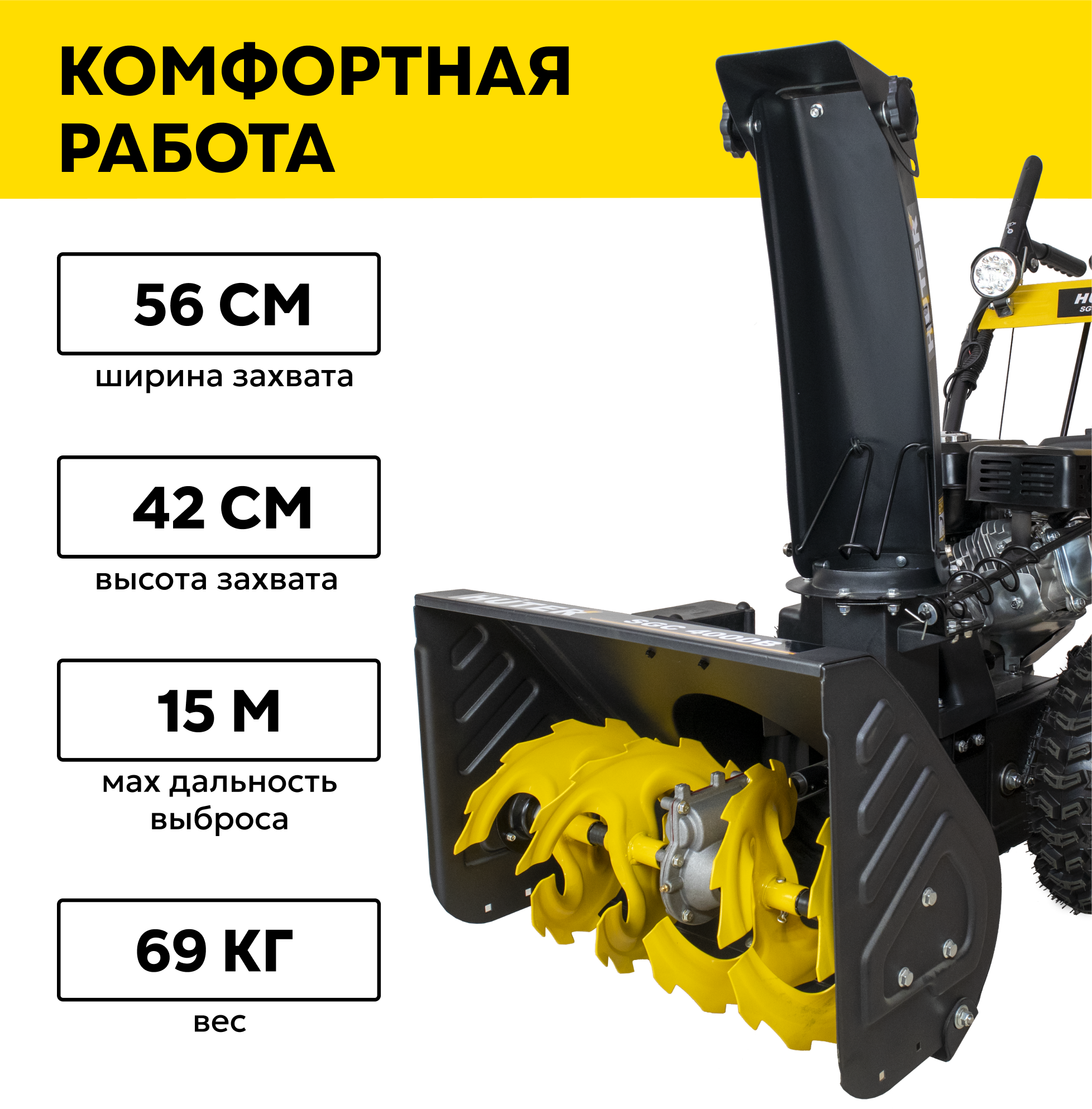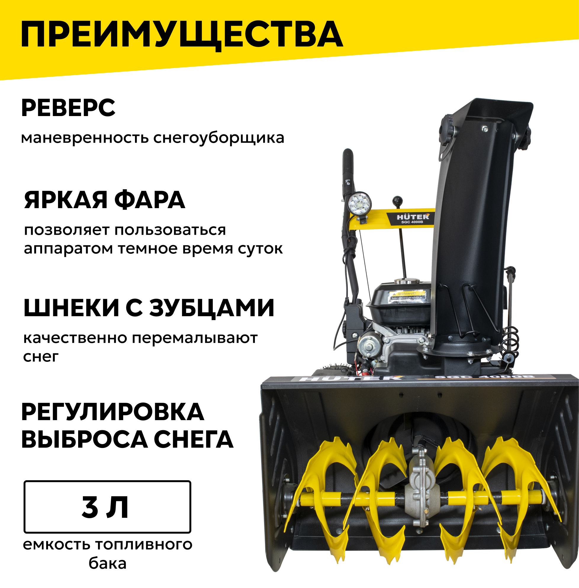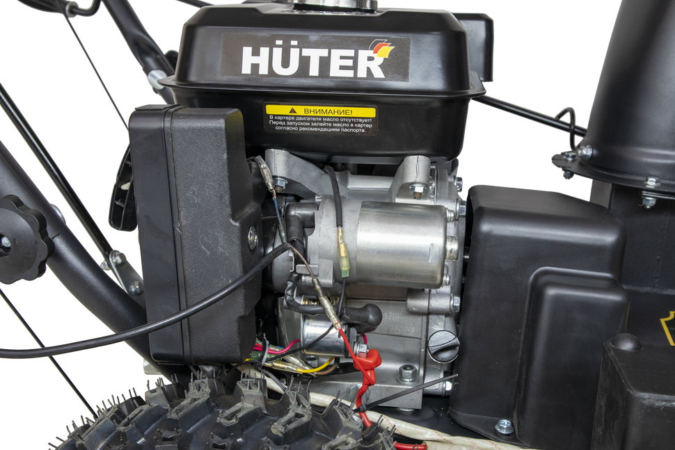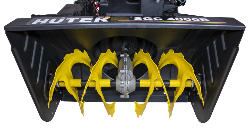 | Прочие особенности и свойства | Снегоуборщик Huter SGC 4000B является самоходным и снабжен ведущими надувными колесами, имеющими покрышки с ярко выраженным зимним протектором, что обеспечивает надежный контакт с поверхностью даже в условиях гололеда. Предусмотрена возможность быстрой, практически на ходу, регулировки направления выброса снега. Прочные металлические лопасти шнека позволяют легко измельчить даже слежавшийся и примерзший снег. Ограничительные башмаки по краям приемного желоба предохраняют его от повреждений и позволяют регулировать высоту от поверхности до его нижнего края. Четырехтактный бензиновый двигатель имеет достаточную мощность, чтобы свободно справляться со всеми нагрузками, связанными с рабочим процессом снегоуборщика и его передвижением. Топливный бак расположен в удобном месте и имеет широкую горловину, что облегчает процесс заполнения его бензином. Снегоочиститель полностью автономен и не нуждается в посторонних источниках энергии. Фонарь позволяет проводить уборку снега в темное время суток. Стартер:ручной стартер/электрозапуск от АКБ 12 В |