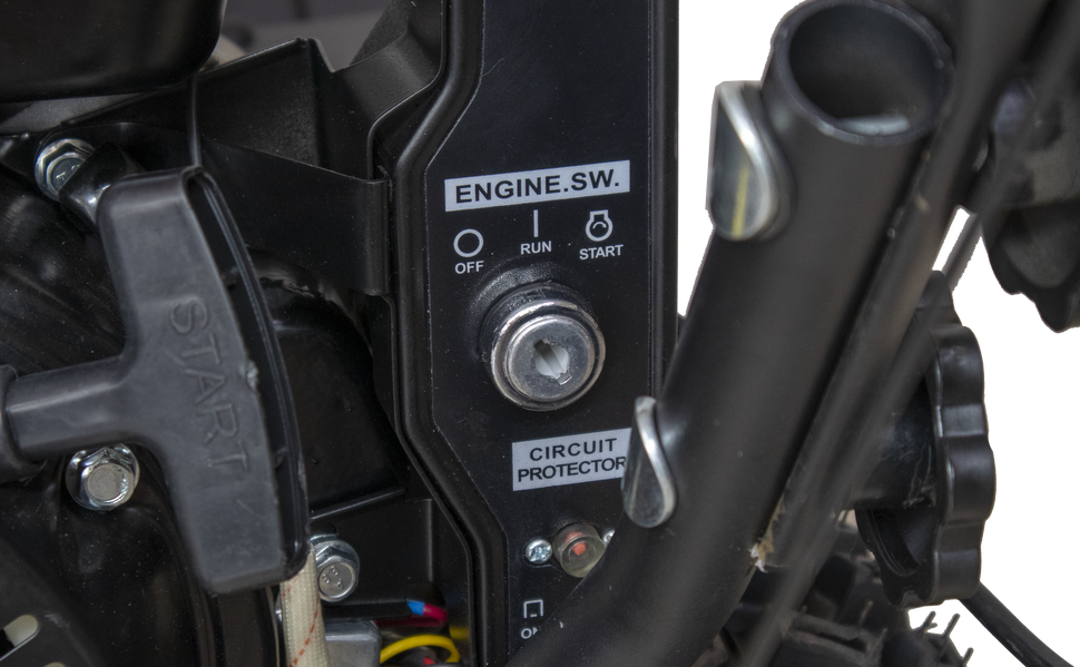 Наличие фары позволяет убирать снег в условиях слабого освещения. Главным преимуществом является наличие электростартера от АКБ, который позволяет легко и комфортно запускать снегоуборщик, не привязываясь к источнику питания.