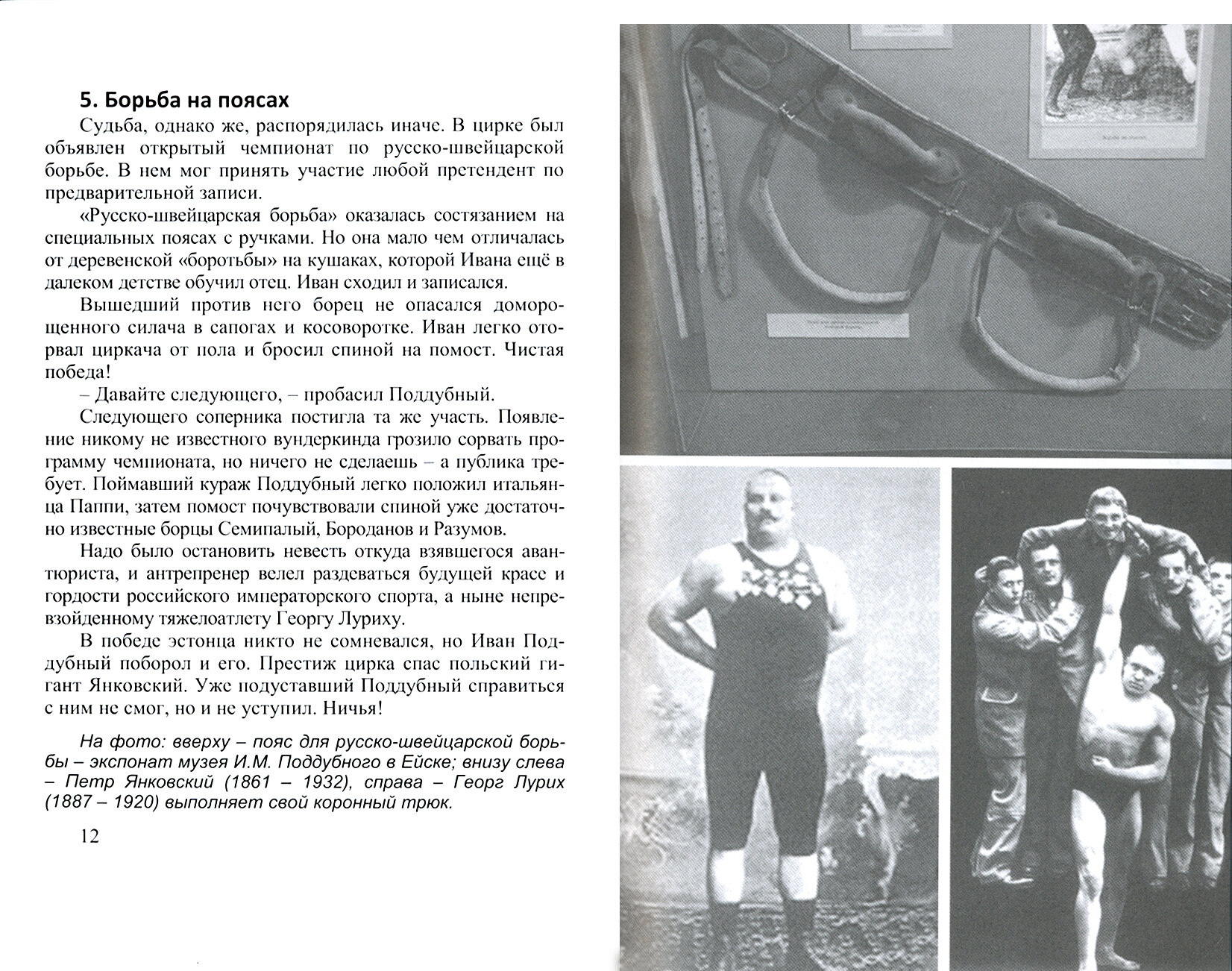 Замечательная книга для чтения в дороге. Автор описывает становление греко-римской (тогда она называлась французской) борьбы в мире. Есть фото всех первых чемпионов мира по борьбе классическим стилем. Открыты имена менее известных русских борцов. Состязания борцов в начале двадцатого века привлекали внимание широкого круга людей и были популярны в России и европейских странах.