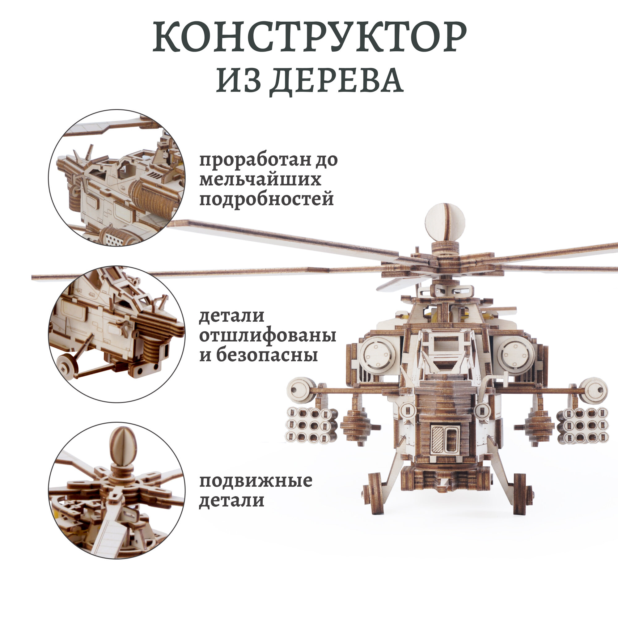 Детали конструктора изготавливаются из березовой фанеры высшего сорта с помощью лазерной резки. Они отшлифованы и совершенно безопасны для детей.