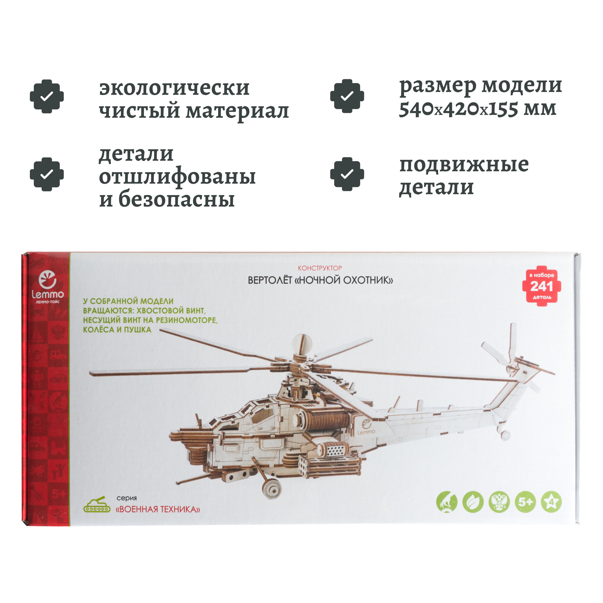 После сборки игрушкой можно даже играть. Главной особенностью модели является резиномотор. У собранной модели вращаются: хвостовой винт, несущий винт на резиномоторе, колеса и пушка. При желании игрушку можно раскрасить акриловыми или гуашевыми красками.