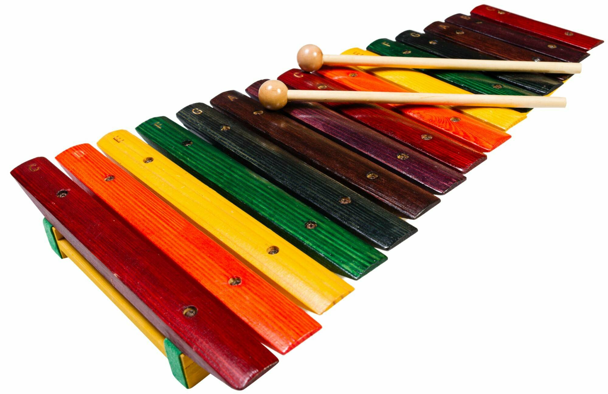У данной модели 15 разноцветных деревянных брусочков, соответствующих нотам, и 2 палочки.